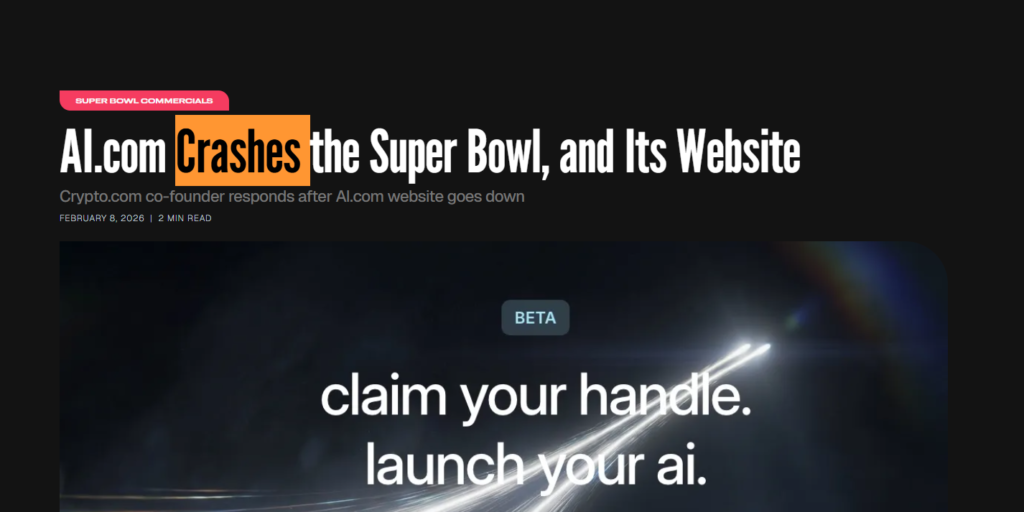 On Super Bowl Sunday 2026, ten million dollars evaporated in real time. Crypto.com spent $70 million acquiring ai.com and ran a Super Bowl ad promising to accelerate AGI. Instead, users got a 504 Gateway Time-out error. The site crashed before anyone could test anything, and the UI looked like a weekend hackathon project. If you’ve been wondering whether the AI bubble 2026 has reached its peak, stop wondering. The emperor just spent $80 million on clothes that don’t exist and tripped on the runway in front of 115 million people.