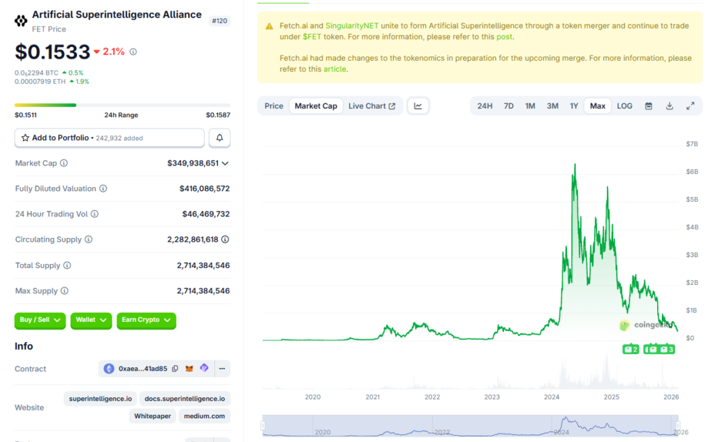 In March 2024, Fetch.ai, SingularityNET, and Ocean announced a merger. The new token, $ASI, was valued at $7.5 billion fully diluted valuation. The pitch was decentralized superintelligence, on-chain AI agents, and a people’s alternative to OpenAI. The reality was a vague roadmap, no competitive models, and a governance nightmare that was slower and worse than centralized APIs. By 2025, the merger had stalled, tokens never converted, and FET was down roughly 70 percent. AGIX and OCEAN were down 80 percent or more. You can’t rebrand 2017 infrastructure into frontier AI. Narratives don’t change physics.