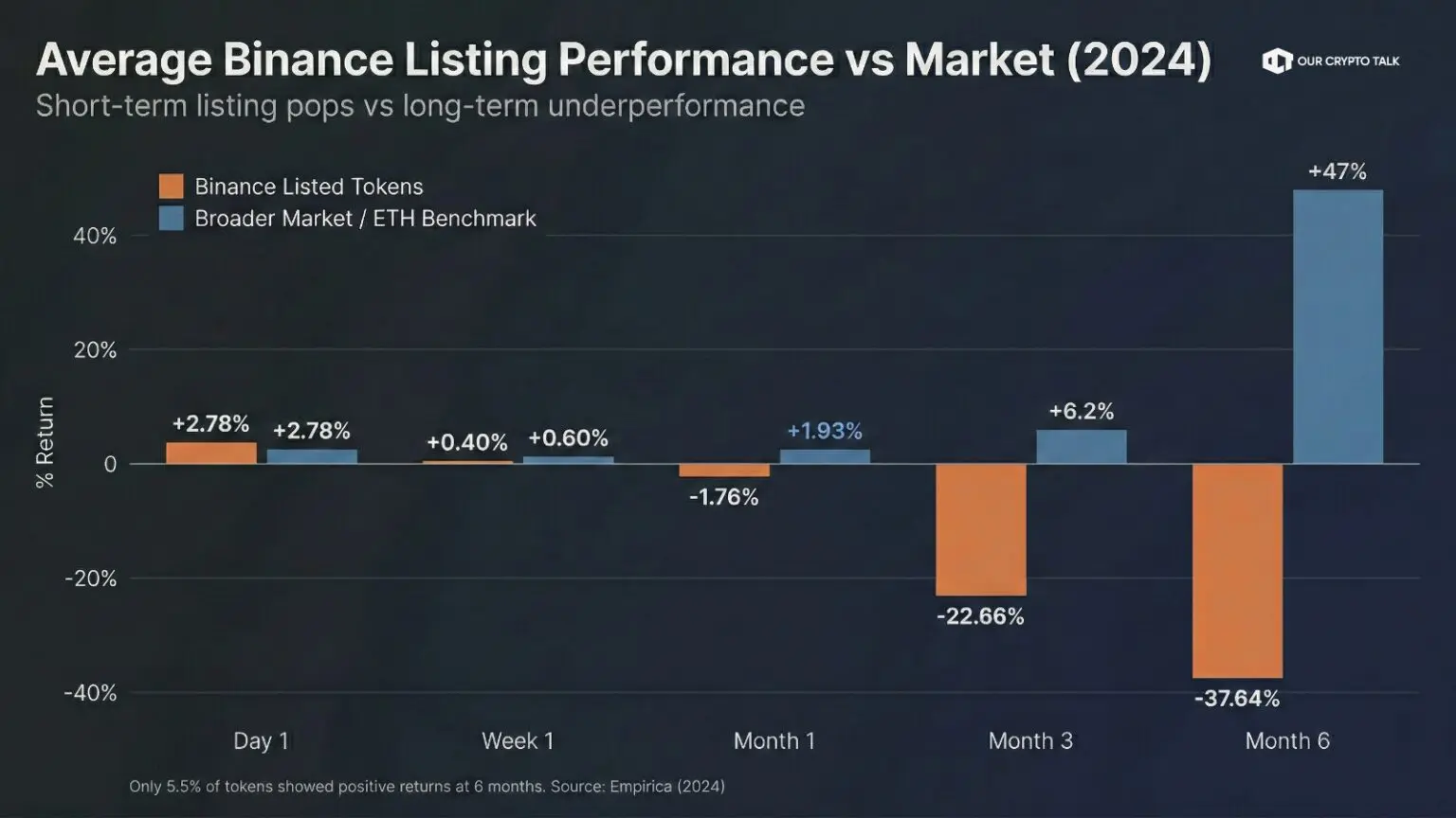 The Empirica analysis went further. When they looked at all 500+ tokens listed on Binance since the exchange’s founding, the six-month performance trailed the market by an average of 39.46%. Meaning if you had invested equal amounts into every single Binance listing since inception and held for six months, you would have dramatically underperformed simply holding ETH.