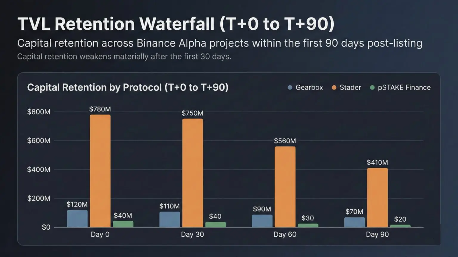 According to historical data from DeFiLlama, over 70% of the TVL of projects launched via Binance Alpha was halved within three months of listing. The Binance Effect reversal was even more pronounced in the Alpha category than in standard listings.