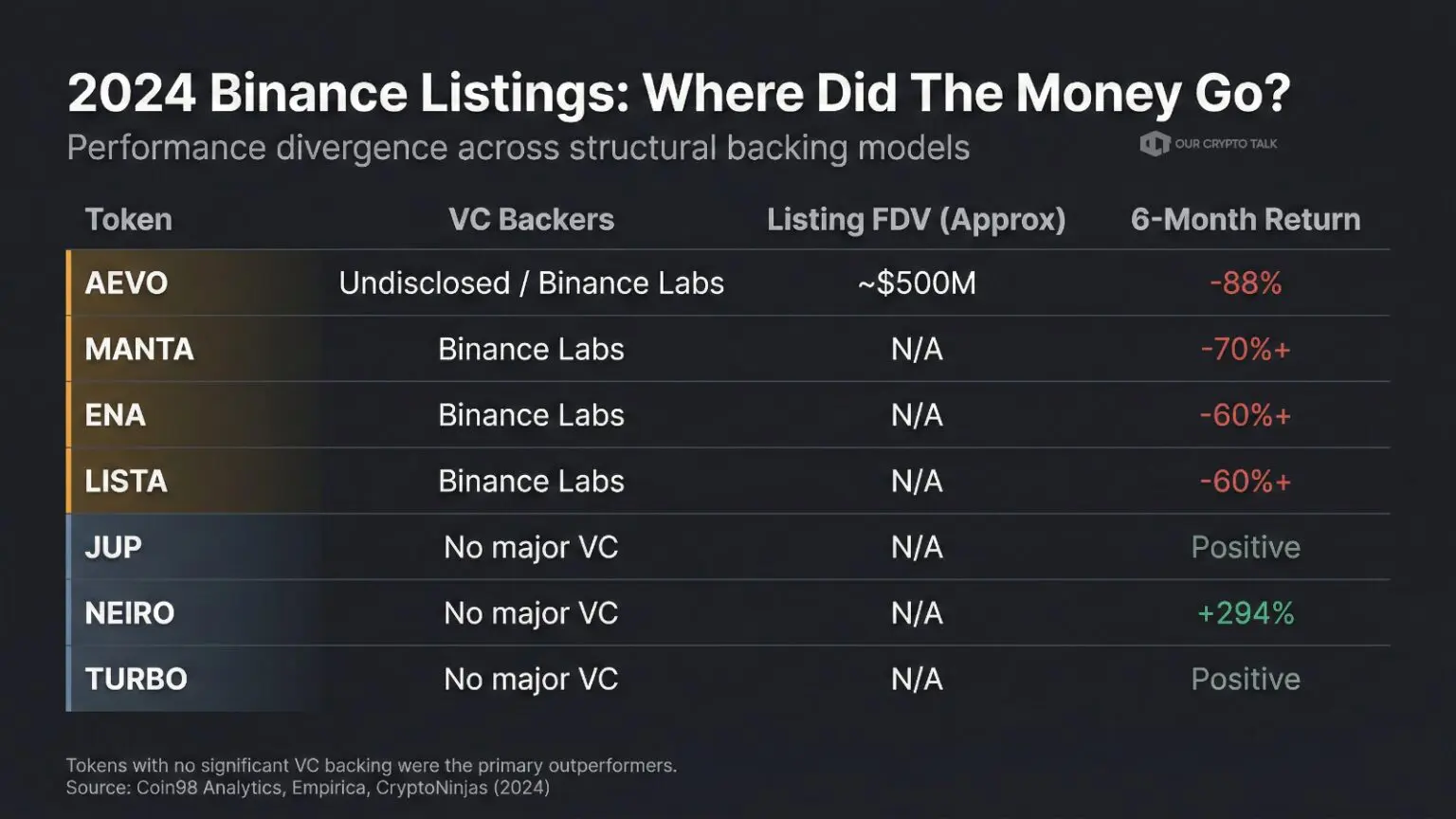 The only category that has consistently bucked the trend? Meme coins with no significant VC backing and no listing fee arrangements. JUP, NEIRO, WIF, TURBO: the tokens that outperformed in 2024 were almost all in this category. No insiders with locked allocations, no VCs needing exits, no $4 billion FDV at listing.