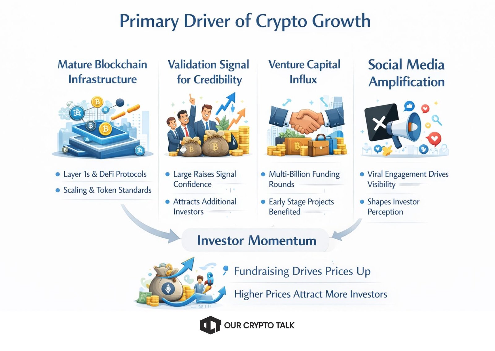 Crypto fundraising provides liquidity and it increases market cap. Higher market cap strengthens narrative. Strong narrative attracts more users and investors. This attracts more capital, reinforcing the cycle.