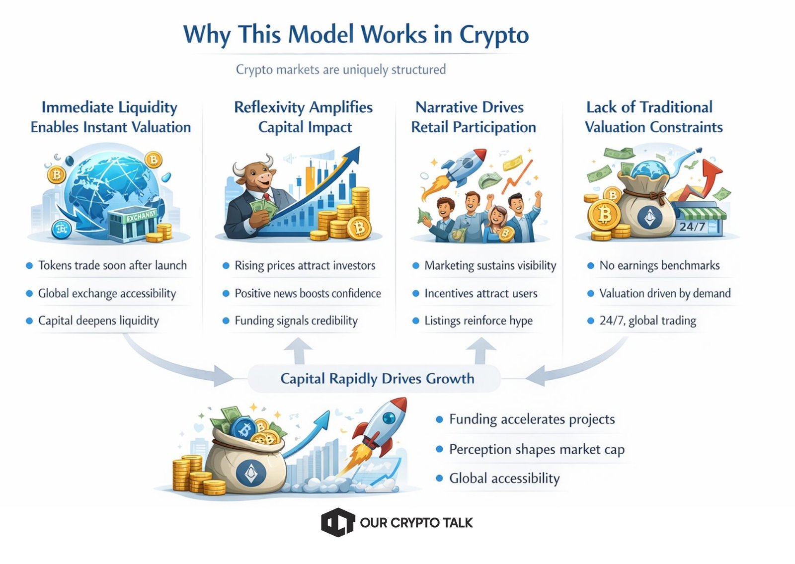 Unlike stocks, crypto lacks valuation anchors such as earnings, profit, or cash flow requirements. Token valuation is driven primarily by supply, demand, liquidity, and expectations of future growth. This allows perception and capital inflow to directly shape market cap. Combined with global accessibility and 24/7 trading, crypto enables capital to rapidly influence valuation, adoption, and ecosystem expansion.