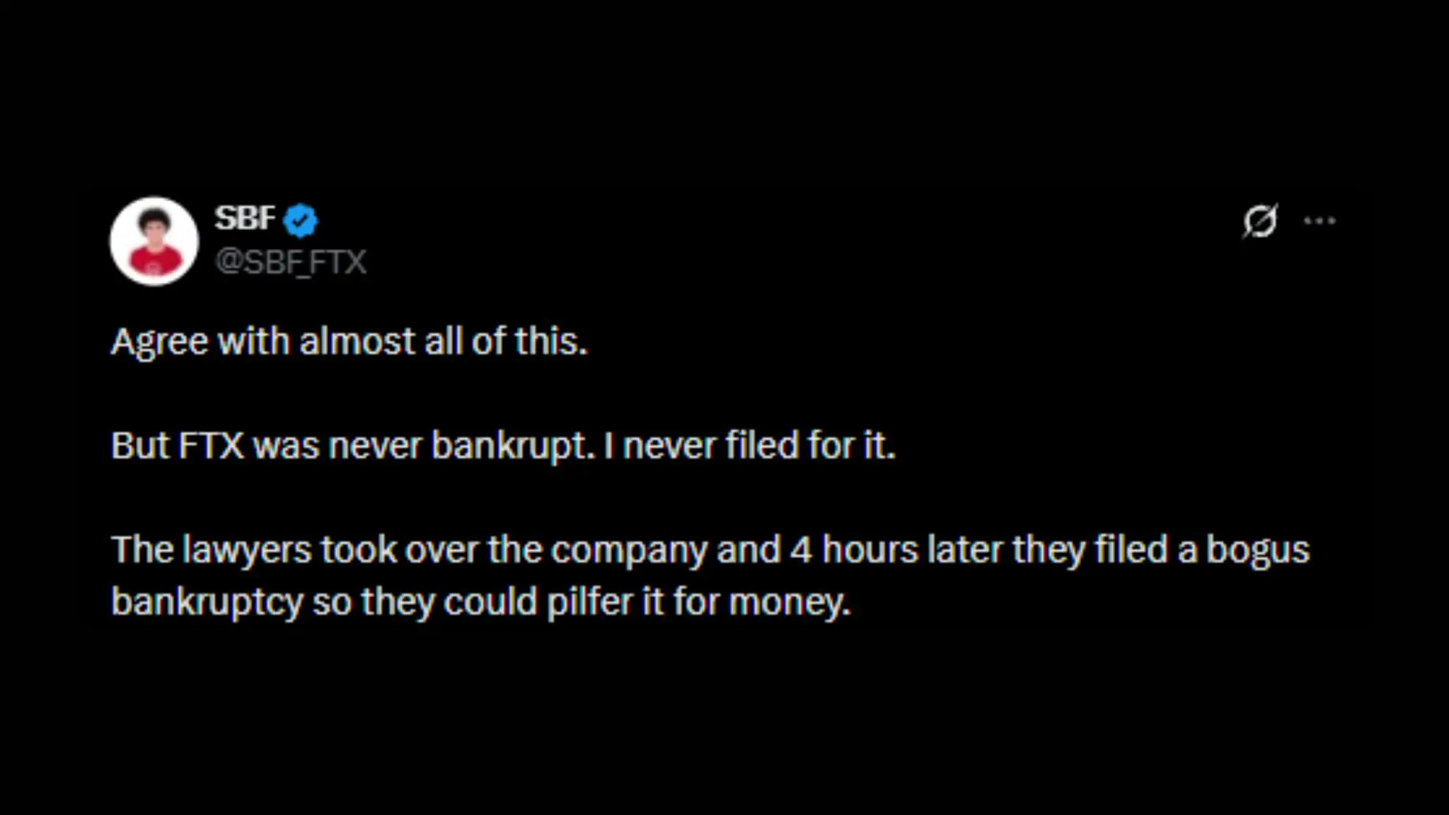 From prison, SBF claimed that FTX was never bankrupt. He argued that he never filed for bankruptcy, that the company was solvent, and that lawyers rushed a Chapter 11 filing to seize control and extract fees. According to him, the collapse was a liquidity crisis, not insolvency.