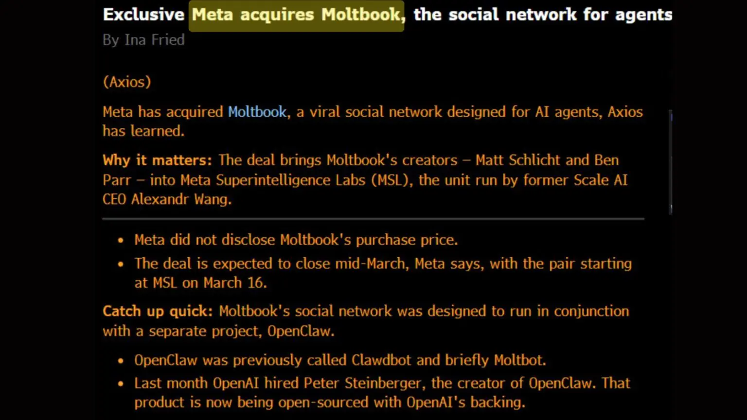 The Moltbook team joined Meta Superintelligence Labs, a research group led by former Scale AI CEO Alexandr Wang.