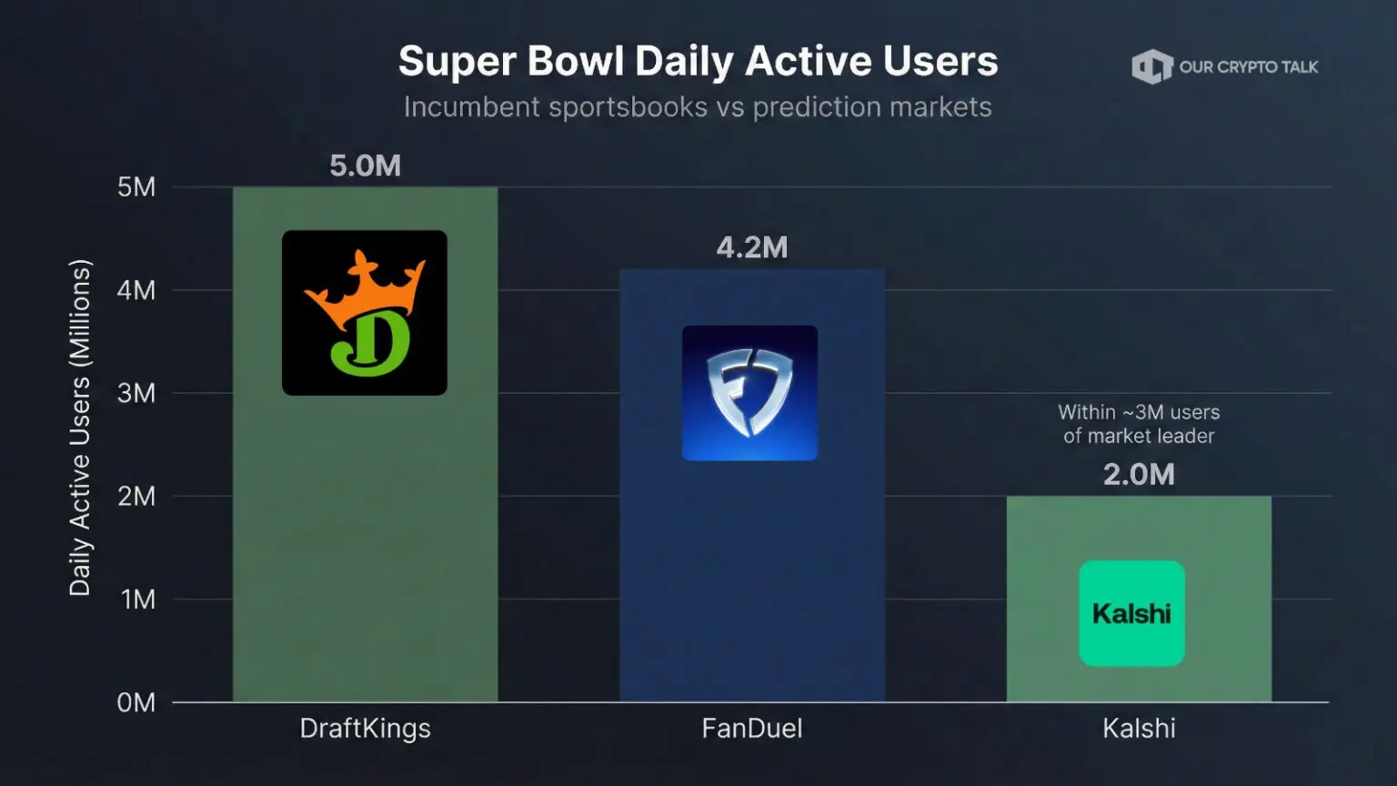 The valuation more than doubled in under 60 days. That doesn’t happen by accident. It happens when you’re growing at 1,100 percent year over year. On Super Bowl Sunday, Kalshi’s app downloads surged 1,544 percent compared to the same period last year. Daily active users jumped over 1,100 percent to nearly 2 million. Kalshi CEO Tarek Mansour told CNBC that Kalshi was the biggest brand of the Super Bowl this year, without running a Super Bowl ad.