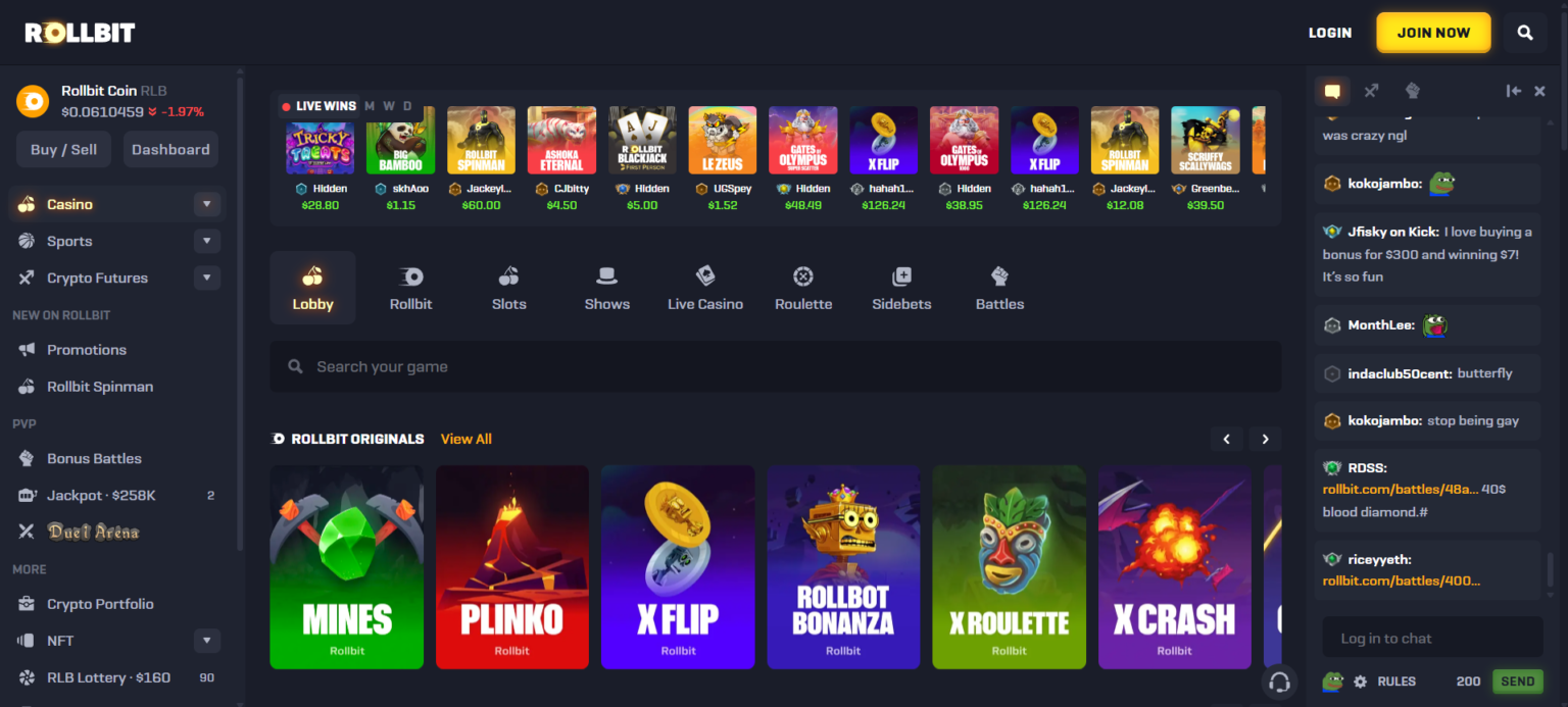 The casino remains Rollbit’s flagship. It offers hundreds of provably fair slots, roulette, and card games, with transparent odds verified through cryptographic hashes. Roughly 10% of casino revenue funds hourly RLB buybacks. Every spin or wager contributes micro-revenue that sustains token deflation.