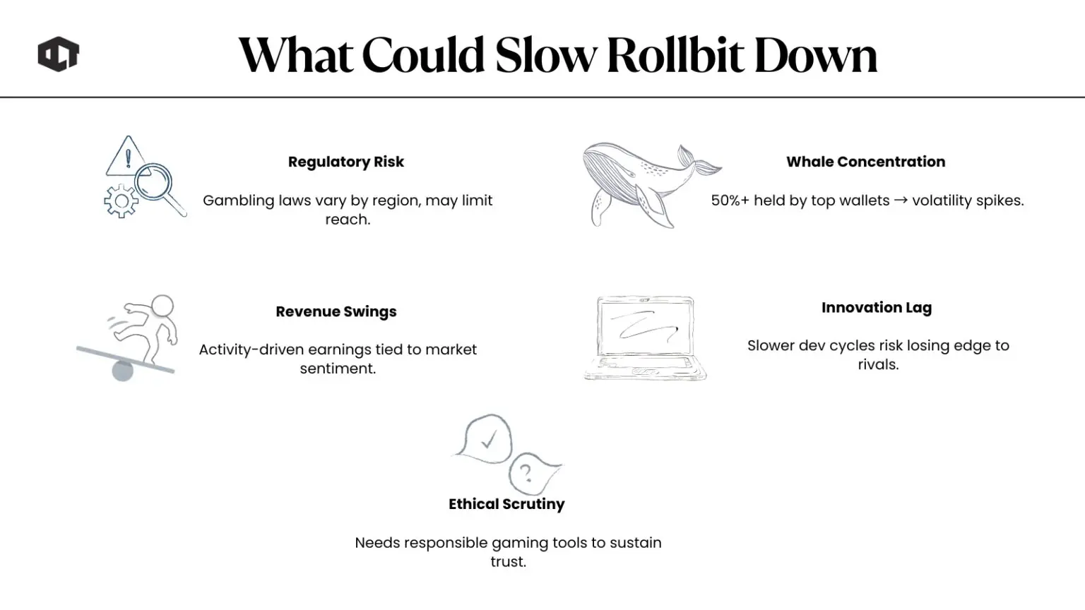 Gambling regulation varies across jurisdictions. The U.S., UK, and parts of Asia restrict crypto wagering, limiting potential user pools. Any tightening could impact transaction volume or force KYC expansions. For Rollbit GambleFi, regulatory clarity will determine its scalability.