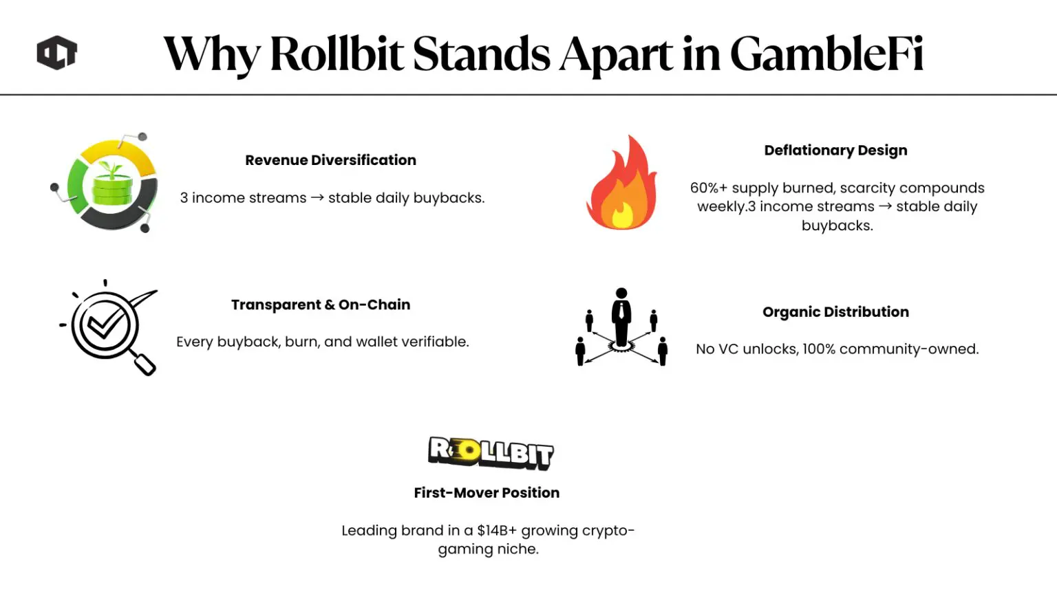 Rollbit represents the mature face of GambleFi, an ecosystem where entertainment meets sustainable economics. Its deflationary tokenomics, transparent revenue streams, and multi-product design have kept it resilient through multiple market cycles. With over $480 million in total revenue generated and 60% of its supply retired, Rollbit has proven that crypto casinos can operate with real fundamentals.