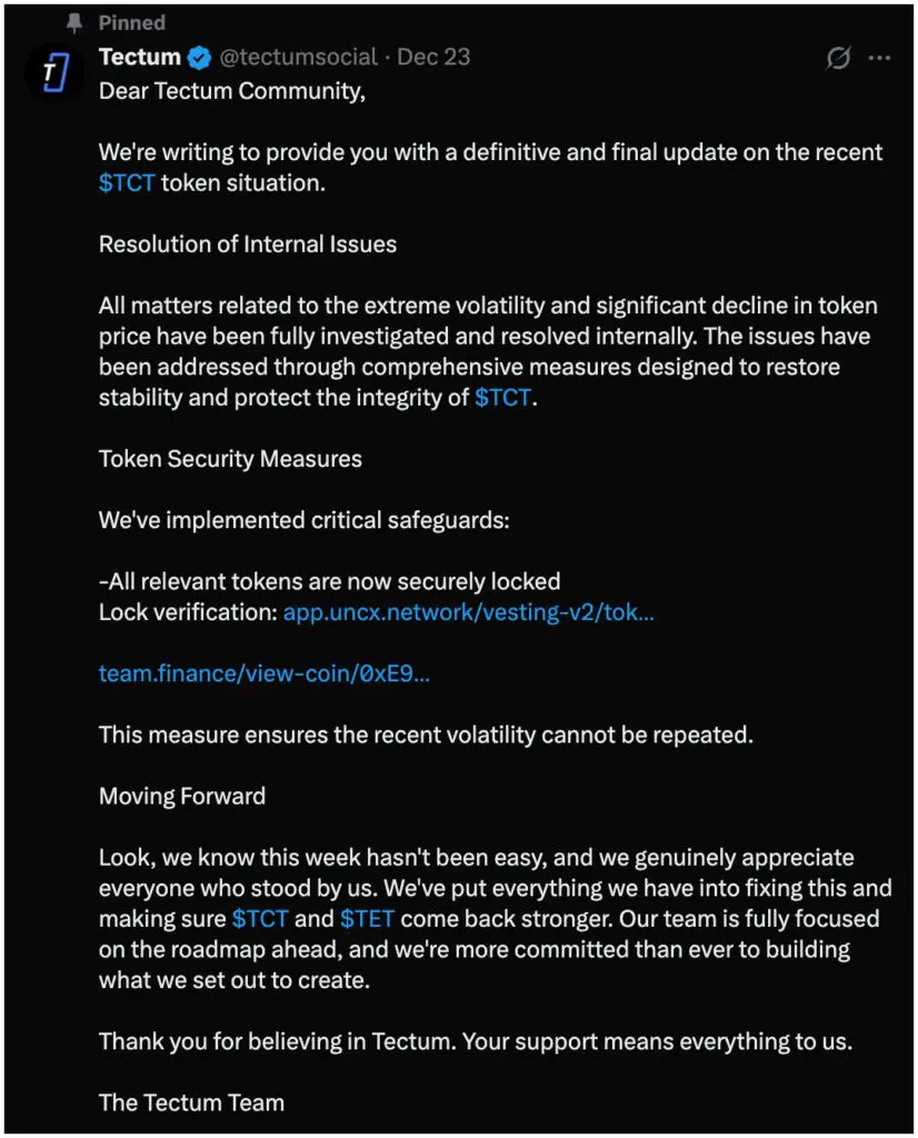 Initial response: The Tectum team eventually addressed the crisis. They did so after several days of rising pressure from the community. On December 11, 2025, they released a public statement. In that message, they confirmed that the sell-off came from someone close to the core team. They described the incident as unexpected. They also said they were negotiating to repair the damage. This likely meant they were speaking with the seller to recover funds or apply another remedy. However, the initial explanation contained few details. As a result, the community continued to worry.