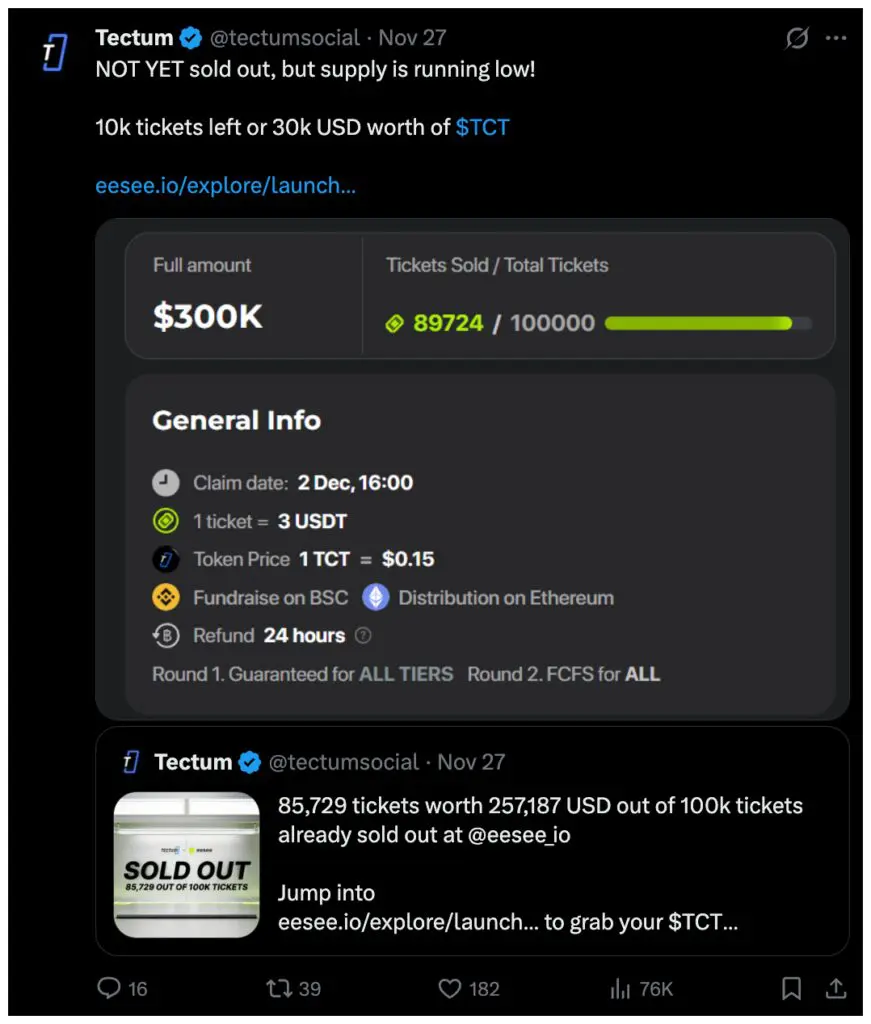 Tectum ran several presale rounds for TCT in November 2025. The public token sale began on November 18, 2025. At that point, the team opened TCT sales on multiple community launchpads such as KingdomStarter, Eesee, Kommunitas, and GemPad. Each platform offered allocations. According to reports, all rounds sold out quickly, often within 24 hours. In total, the presale raised more than 800,000 dollars from early buyers.