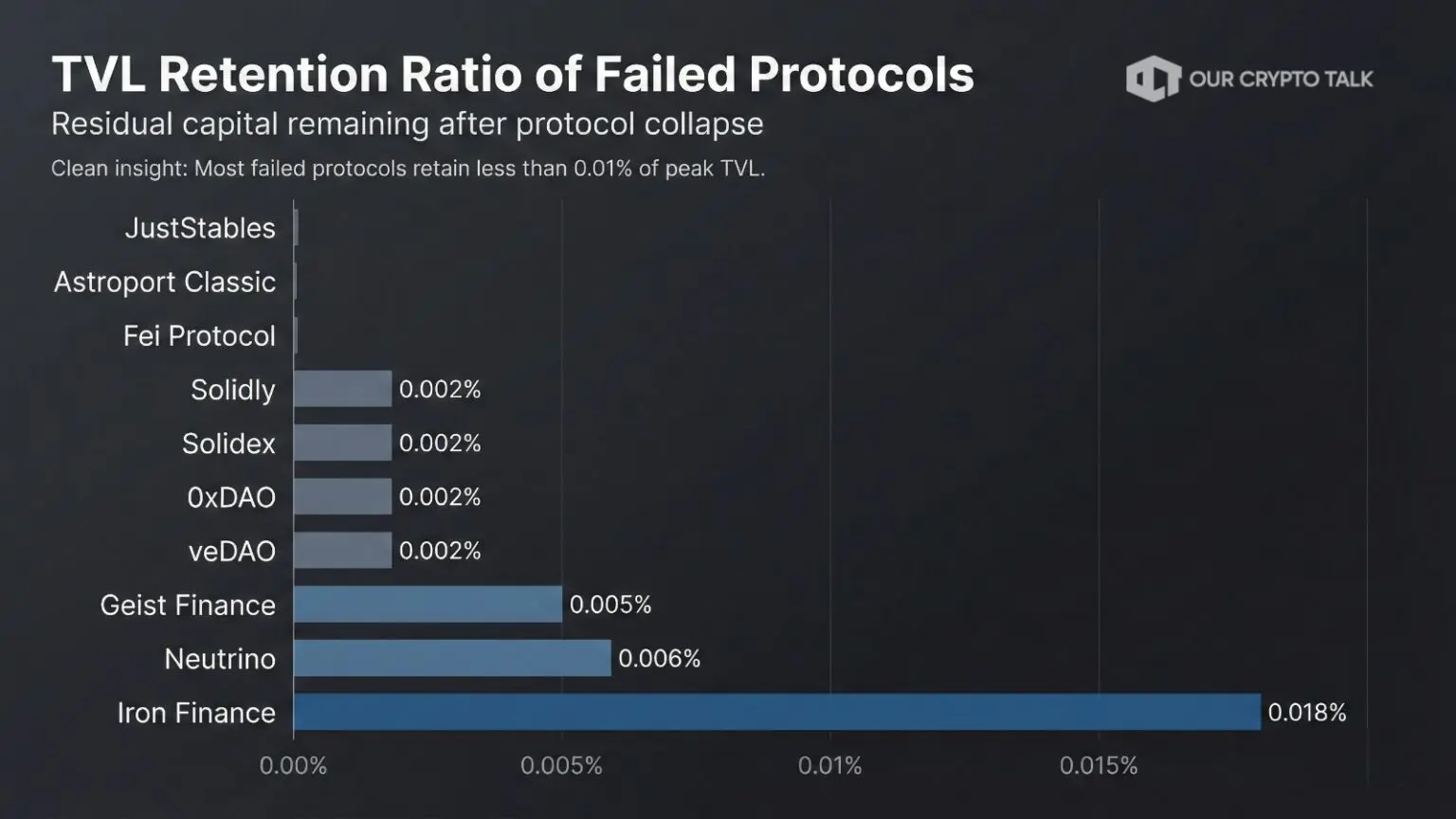This pattern repeats across cycles. Mdex: 90 percent TVL loss in 24 hours. Saber: 90 percent gone within a day of peak. Geist Finance: $3.75 billion to effectively zero. These are not obscure failures. They were among the largest protocols on their respective chains.