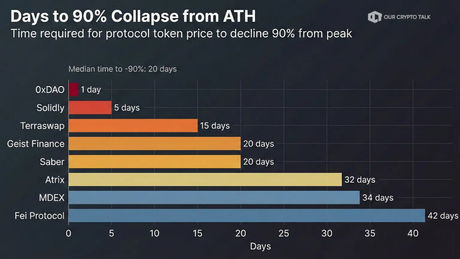For contrast, Terraswap operated without a token. It still died. But it took 134 days to hit a 90 percent drawdown. Without a token, the collapse was slower. There was no reflexive panic triggered by price freefall and simultaneous emissions collapse. Tokens accelerate both growth and destruction. When they break, they compress years of decline into days.