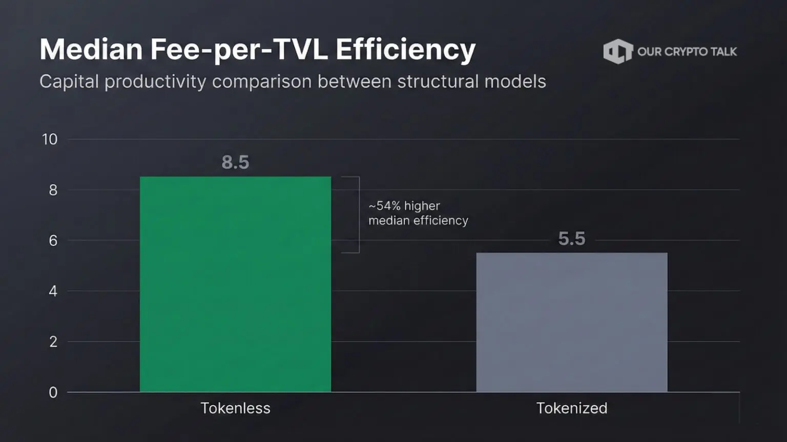 These protocols share critical traits that explain their longevity. First, they optimize for fee density over TVL vanity metrics. Tokenless protocols are 54 percent more capital-efficient, with a higher median fee-to-TVL ratio. Their capital is productive, not parked. Second, they maintain high Volume-to-TVL ratios, meaning capital is actually used, not just farmed. Third, they last five to ten times longer than tokenized protocols. They are built for decades, not quarters.