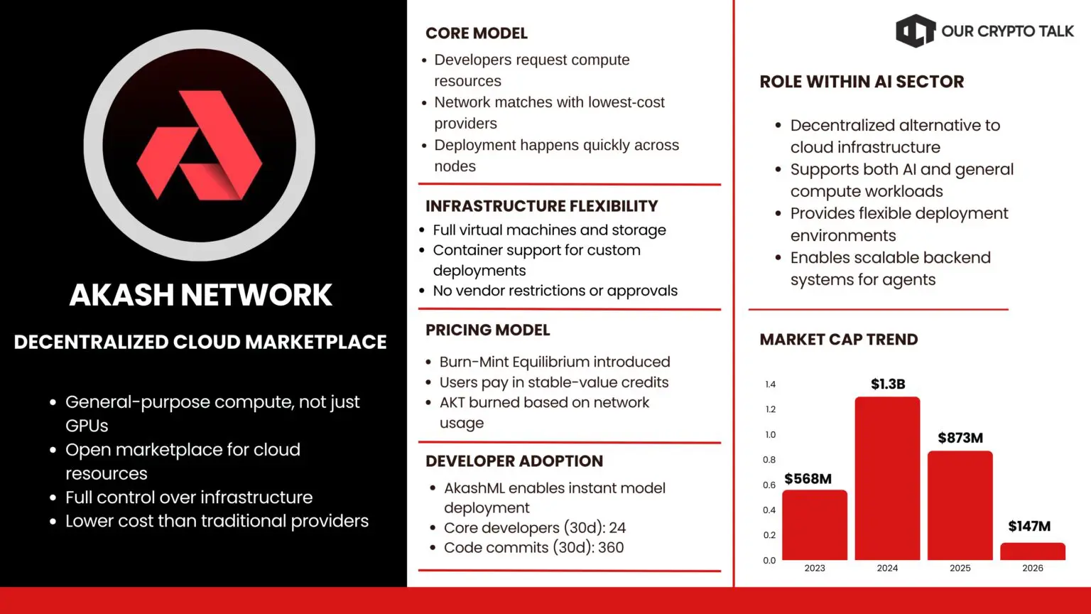 $AKT operates in decentralized compute, with a market cap of $132M. Akash approached the same problem from a broader angle. It built a decentralized cloud that handles general-purpose compute, not just GPUs. The network works as a marketplace. Developers define what they need. The system matches them with providers offering the best price. Deployment happens quickly, and providers earn AKT for running workloads.