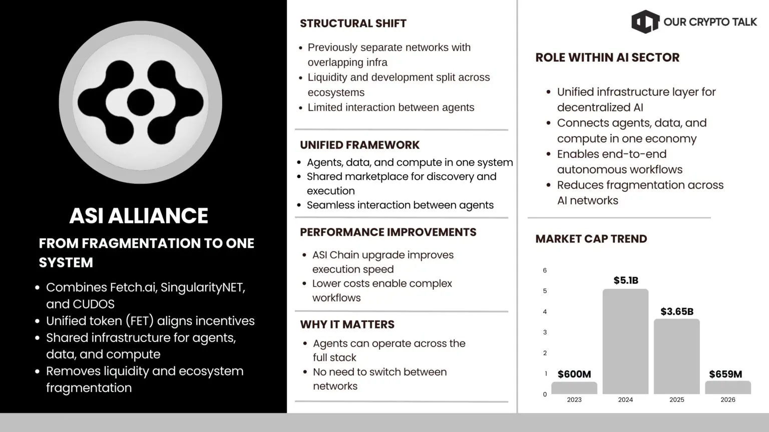 The ASI Alliance sits in the agent category with a $524M market cap. The ASI Alliance removed fragmentation. Before the merger, Fetch.ai, SingularityNET, and Ocean Protocol operated separately. Infrastructure overlapped. Liquidity was split. Agents struggled to interact across systems.