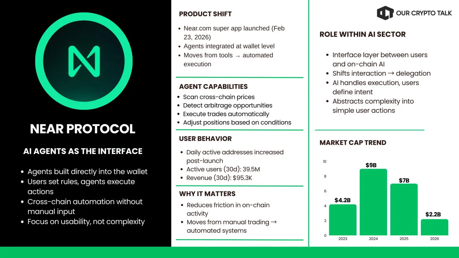 $NEAR, at a $1.8B market cap, is positioned around agent-focused infrastructure. NEAR focused on the agent layer and solved usability. The Near.com super app launched on February 23, 2026 with agents built directly into the wallet. These agents scan cross-chain prices, detect arbitrage, execute trades, and adjust positions without constant input.