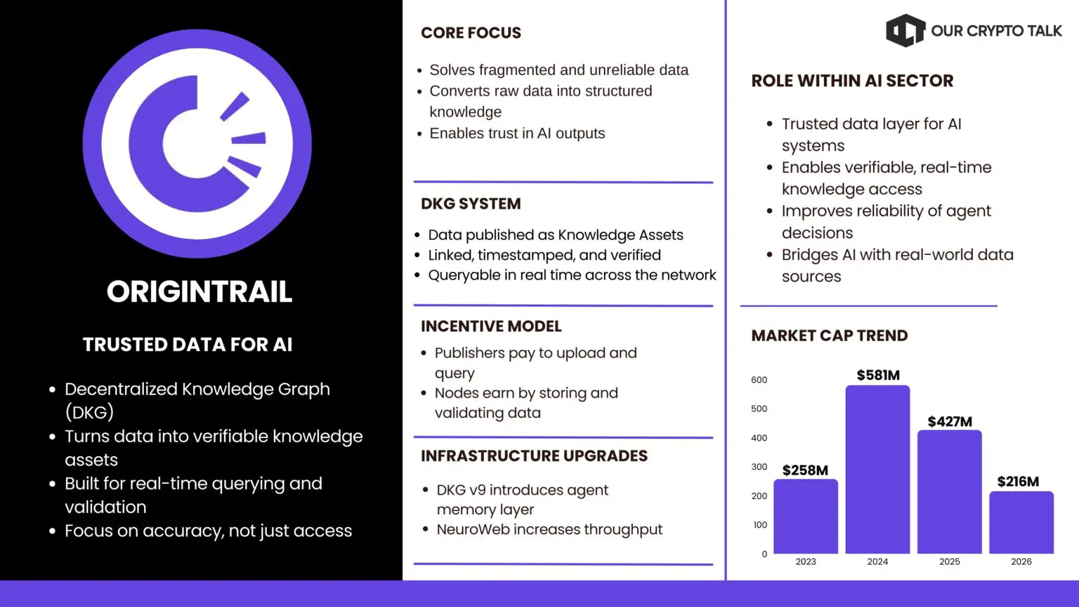 $TRAC sits in the AI data layer, valued at $171M. OriginTrail built the layer most AI projects ignored. Trusted data. Its Decentralized Knowledge Graph turns fragmented information into structured, connected assets that can be queried in real time. Enterprises, institutions, and developers upload data as Knowledge Assets. Each one is linked, timestamped, and verified across a distributed network.