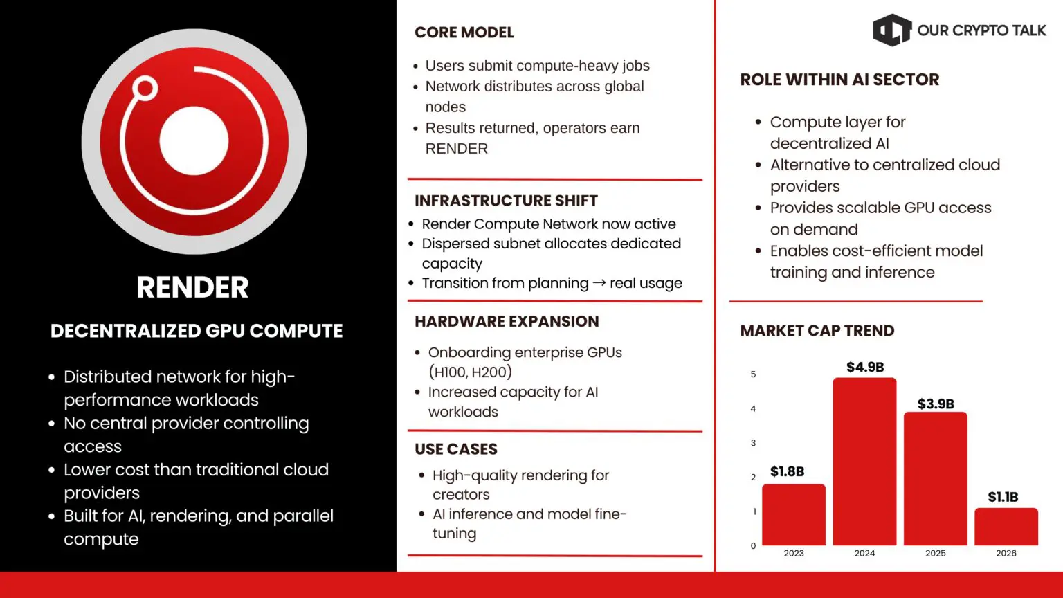$RENDER, a leading compute network, holds a $966M market cap. Render spent years building decentralized GPU infrastructure. In early 2026, it finally reached the point where serious AI workloads could run on it. The model is simple. Users submit jobs that require heavy parallel compute. The network distributes those jobs across thousands of nodes. Results come back, and node operators earn RENDER tokens. No central provider sits in the middle.