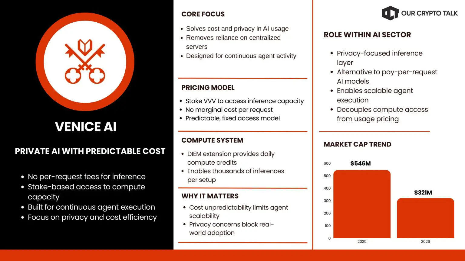 $VVV is part of the inference layer, with a market cap of $258M. Venice AI focused on two problems that matter in practice. Cost and privacy. Most AI systems require sending data to centralized servers and paying per request. That model breaks for agents that need to run continuously.