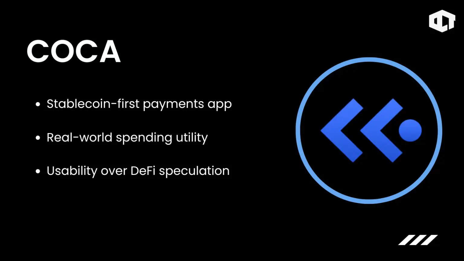 COCA is a stablecoin-focused “challenger bank” style app launched in 2025. It targets real-world spending utility through non-custodial wallets, debit and virtual cards, real-time conversions, and cashback reward programs. The app uses MPC security and aims to simplify stablecoin usage for everyday payments.