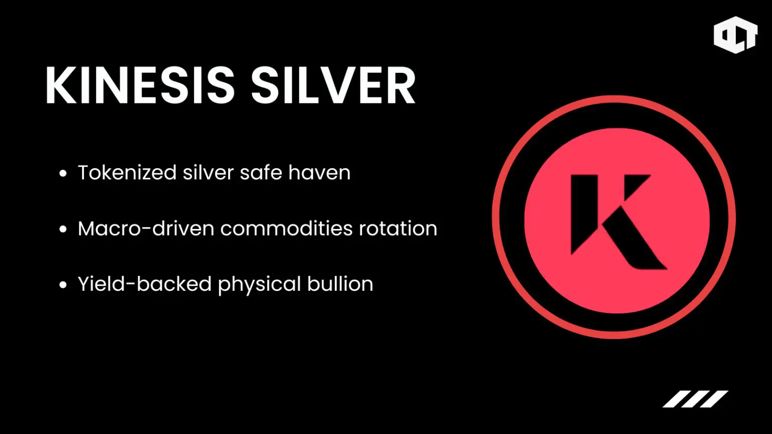 Kinesis Silver (KAG) launched in 2018 as a tokenized asset backed 1:1 by physical silver bullion. It operates within the Kinesis platform, where holders can earn yields through a revenue-sharing model tied to platform usage. This gives KAG a hybrid role as both a precious metals proxy and a yield-bearing commodity token.