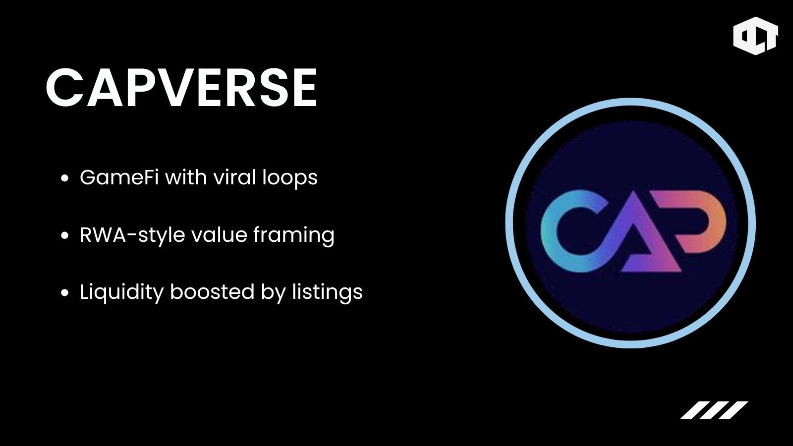 Capverse is a Web3 social mobile gaming project focused on play-to-earn and invite-to-earn mechanics. It also incorporates RWA-related positioning by connecting gameplay rewards to asset-style allocation and micro-ownership incentives.