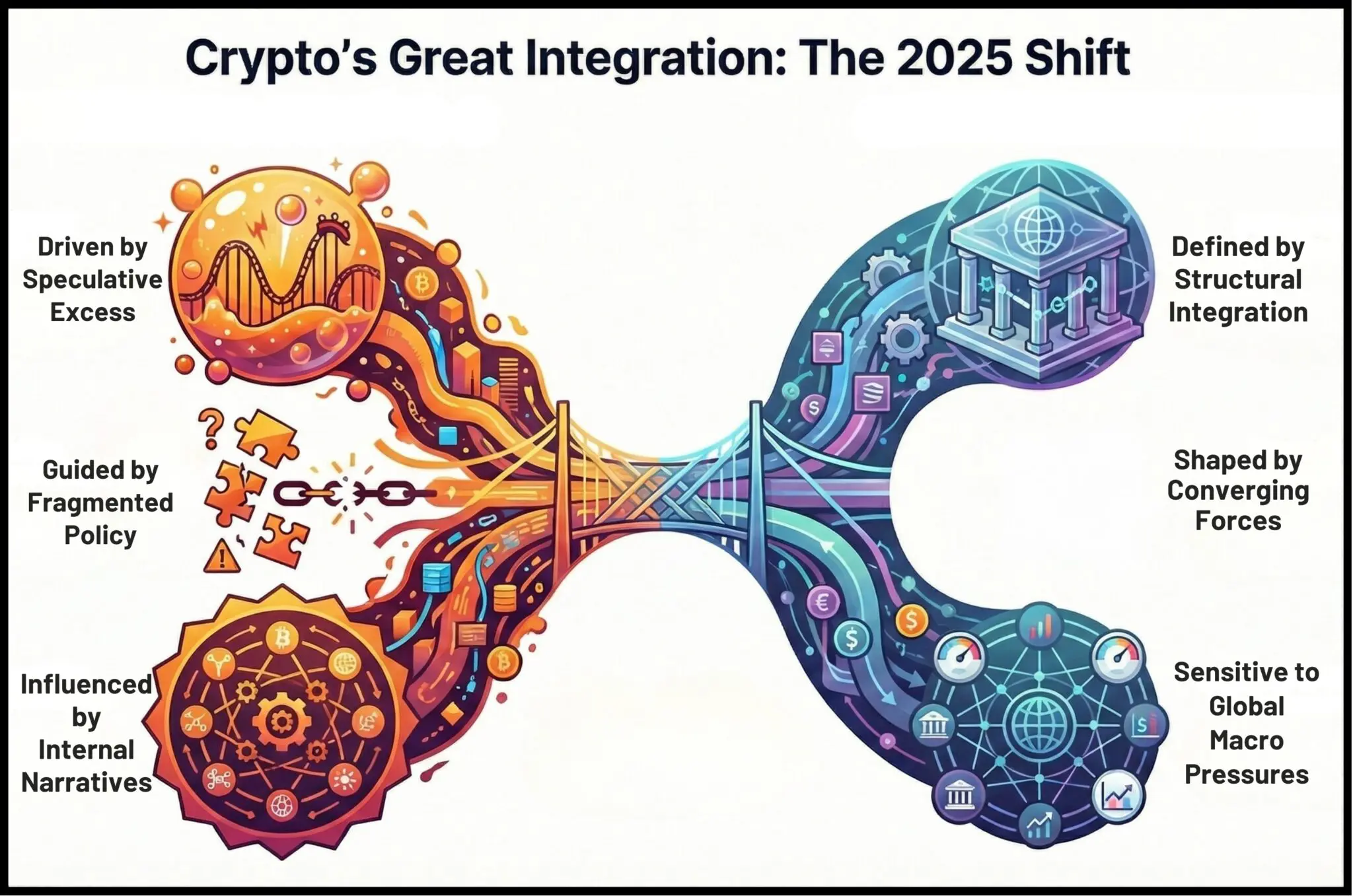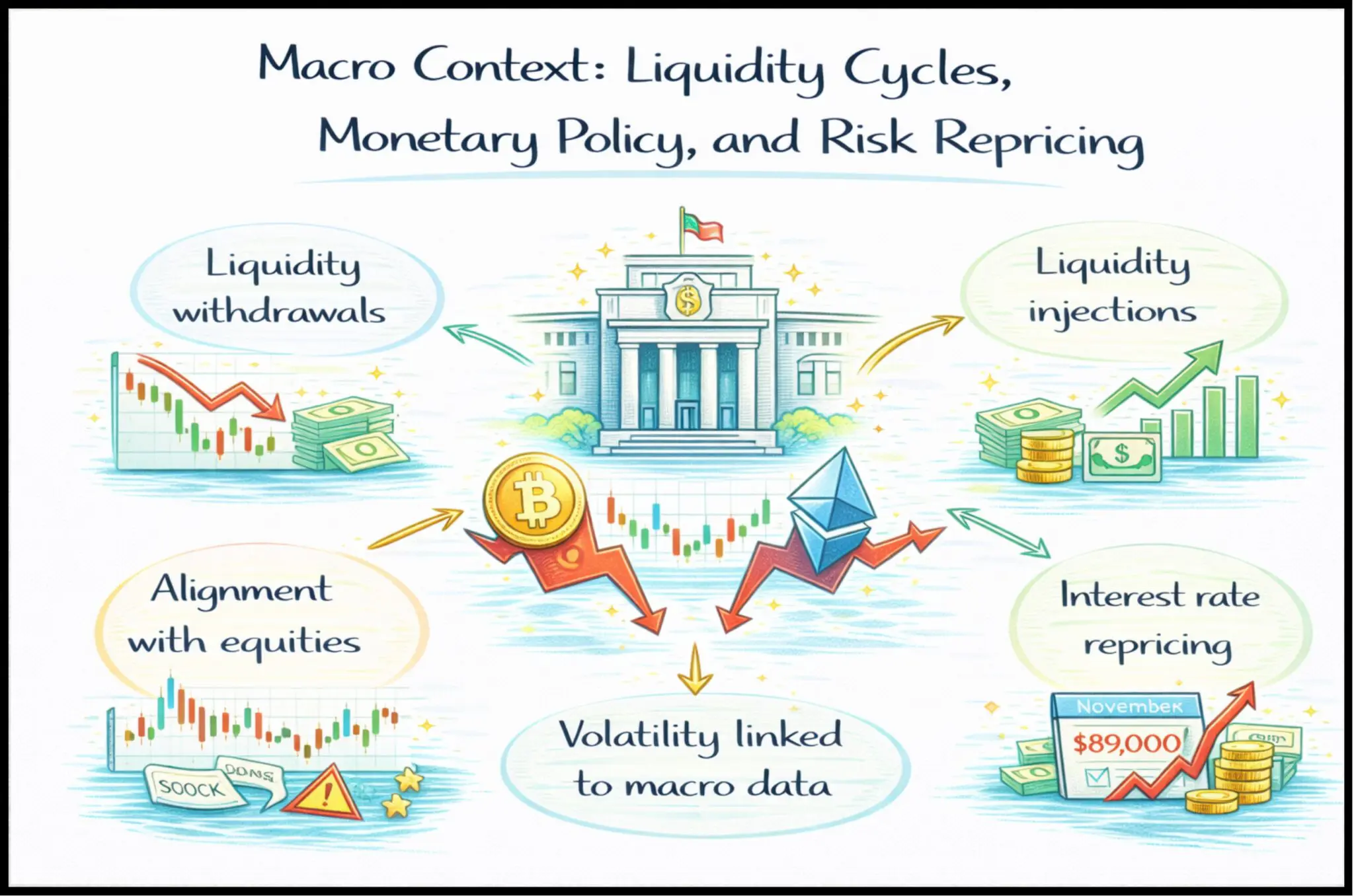 This period marked a structural repricing of crypto’s risk profile. Bitcoin and large-cap digital assets increasingly moved in alignment with equities, credit spreads, and forward rate expectations, reflecting their growing integration into institutional portfolios. Liquidity injections and withdrawals transmitted more rapidly into crypto markets than in prior cycles, amplifying both upside momentum and downside drawdowns. As a result, volatility became less episodic and more continuous, driven by macro data releases rather than crypto-native catalysts alone.