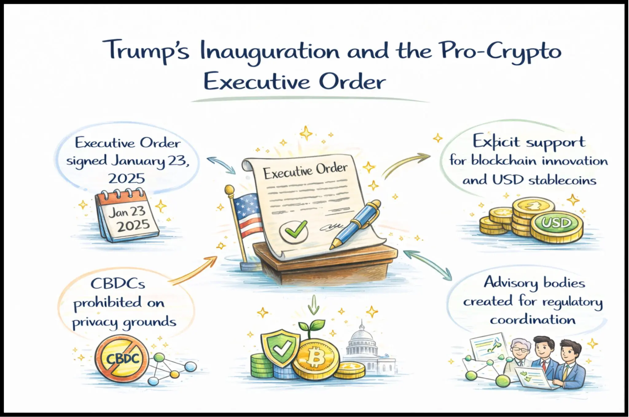 The order emphasized responsible blockchain innovation, support for U.S. dollar–backed stablecoins, and a firm rejection of central bank digital currencies due to privacy concerns. It rescinded restrictive Biden-era policies and established advisory groups tasked with shaping future digital asset regulation.