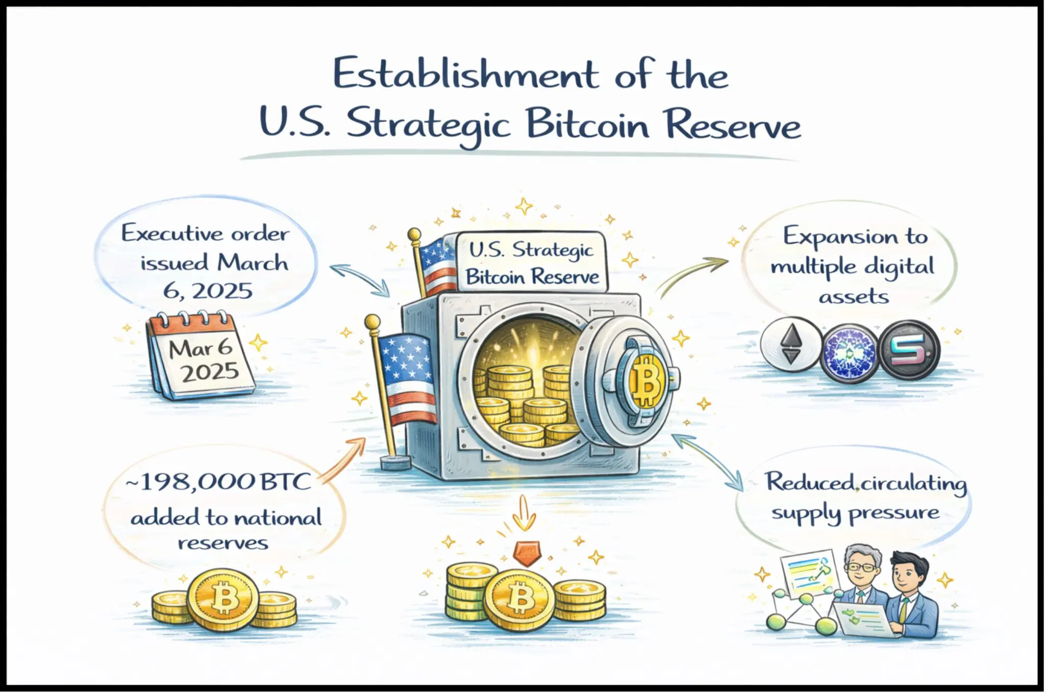 On March 6, 2025, President Trump issued an executive order creating the Strategic Bitcoin Reserve and United States Digital Asset Stockpile. The reserve incorporated approximately 198,000 BTC seized by federal authorities, reframing Bitcoin as a sovereign hedge against inflation and geopolitical risk. By mid-year, the reserve expanded to include other digital assets such as ETH, ADA, and SOL, reflecting a broader acknowledgment of crypto’s strategic relevance.