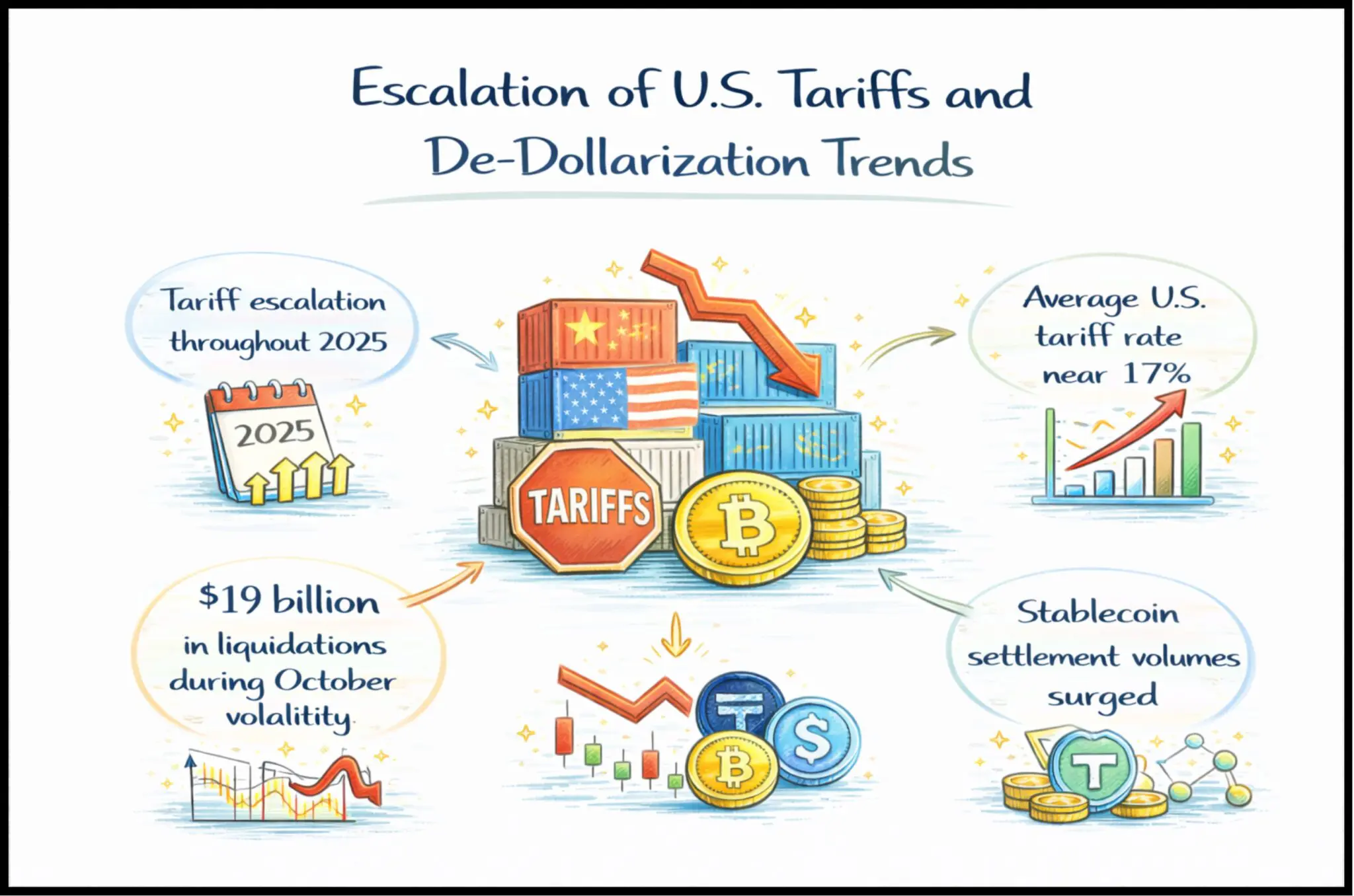 While tariffs contributed to the October 11 flash crash, they also accelerated de-dollarization trends. Stablecoin usage in emerging markets for cross-border settlements rose sharply, with monthly volumes reaching approximately $772 billion.