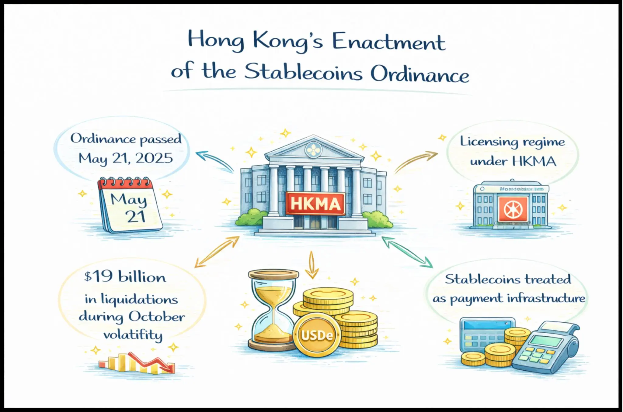 On May 21, 2025, Hong Kong’s Legislative Council passed the Stablecoins Ordinance, effective August 1. The law established a comprehensive licensing regime under the Hong Kong Monetary Authority covering stablecoin issuance, custody, and operations. A six-month transitional period allowed existing operators to comply while reinforcing stablecoins as regulated payment infrastructure.
