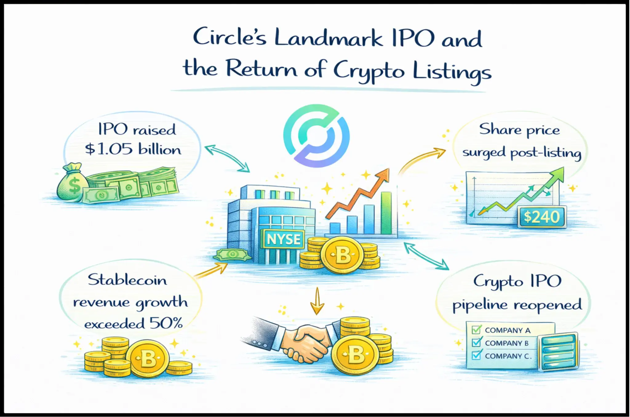 Circle’s initial public offering on June 5, 2025, marked a major reopening of traditional capital markets for crypto-native infrastructure companies. Listed under ticker CRCL, the deal was upsized to raise $1.05 billion at $31 per share, and Circle debuted on the NYSE before surging nearly 500% to $240 by mid-year. The IPO’s market impact extended beyond Circle itself, signaling that stablecoin issuers and crypto payment rails could be assessed through institutional valuation frameworks rather than purely narrative cycles.