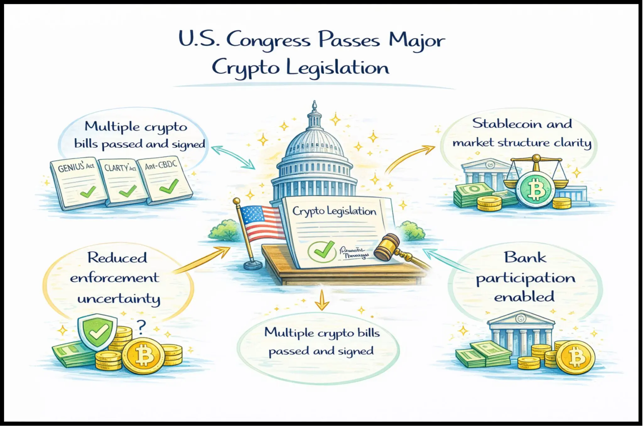 This legislative shift mattered because it moved the U.S. toward rules-based governance instead of enforcement ambiguity, reducing institutional hesitation. It also created a clearer pathway for banks and regulated intermediaries to engage with crypto rails under defined compliance expectations.