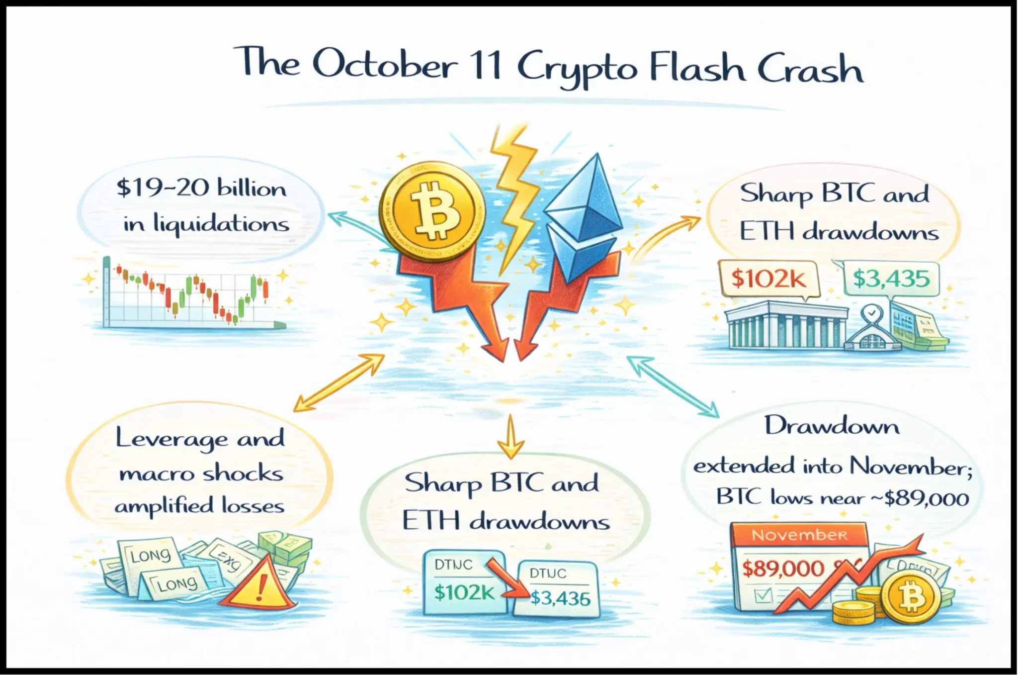 On October 11, 2025, crypto experienced its largest liquidation shock of the year. It was also one of the largest on record. An estimated $19–20 billion was liquidated within 24 hours. Bitcoin fell 12.7% to roughly $102,000. Ethereum dropped 14.3% to approximately $3,435. The selloff was linked to tariff-driven risk-off sentiment and elevated leverage. Broader equity stress also contributed, including declines in AI-related stocks. The move did not remain confined to one session. The downturn extended into November, with Bitcoin falling near $89,000. The episode served as a stress test for market structure. It showed how leverage can rapidly transmit macro shocks into cascading liquidations across venues.