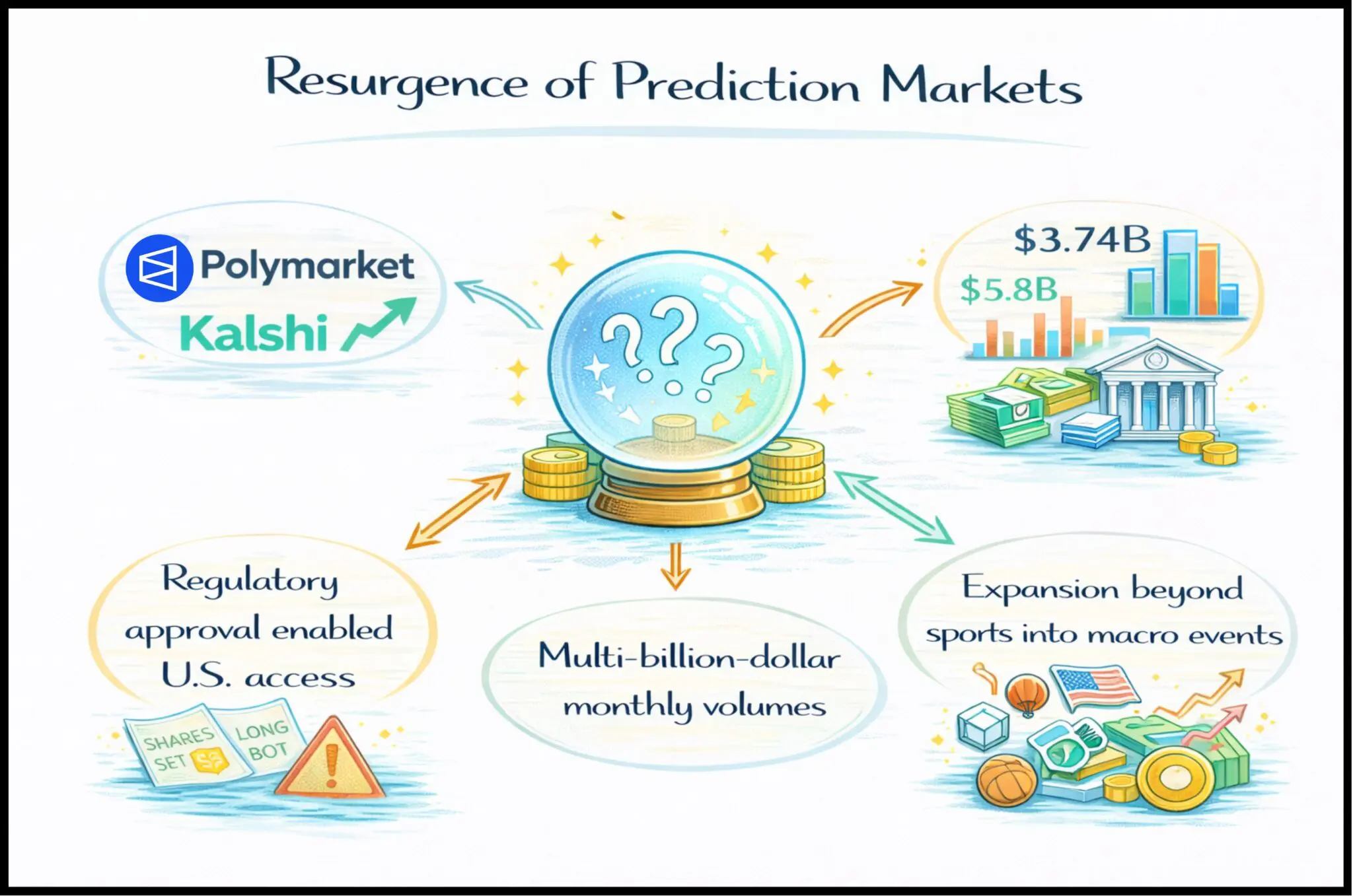 Prediction markets re-emerged as a major crypto-adjacent growth category in late 2025, driven by Polymarket’s U.S. relaunch following CFTC approval on November 25. The category’s scale became difficult to ignore: Polymarket recorded volumes exceeding $3.74 billion in November alone, while Kalshi reached $5.8 billion, alongside a reported $8 billion valuation as products diversified beyond sports.