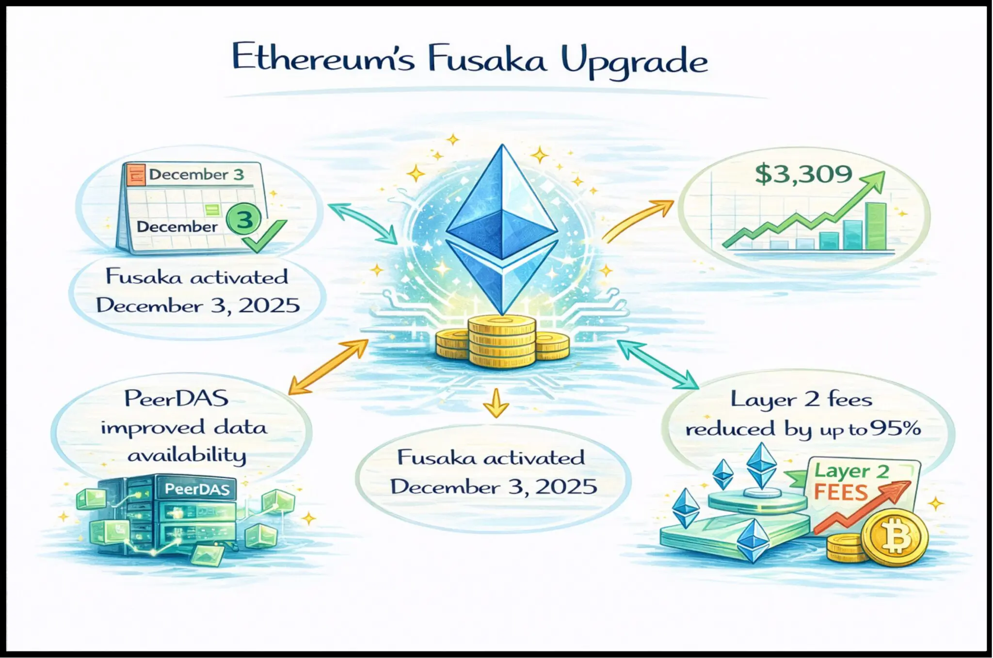 Ethereum’s Fusaka upgrade activated on December 3, 2025. It continued Ethereum’s modular scaling strategy. The upgrade focused on improving data availability and reducing costs for Layer 2 execution environments. It introduced PeerDAS for data availability and increased block gas limits. As a result, Layer 2 fees dropped by up to 95%.