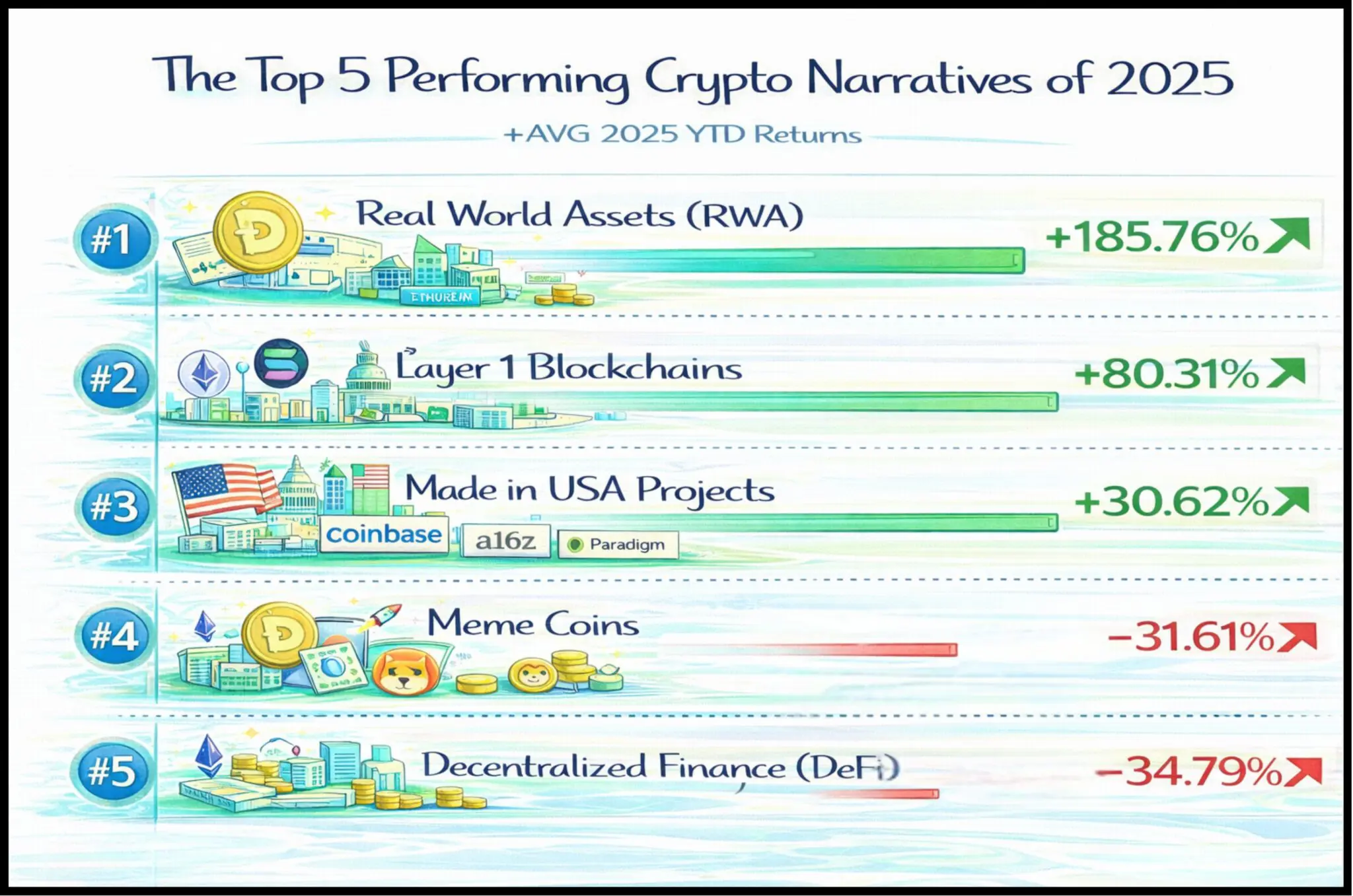 This is why the Top 5 Performing Crypto Narratives of 2025 look structurally different from earlier cycles. CoinGeckoâs year-end tracking ranked the narratives by average YTD price returns across leading tokens and found a stark split: only the top three narratives ended the year in positive territory: Real World Assets (RWA) +185.76%, Layer 1 Blockchains +80.31%, and Made in USA projects +30.62% while Meme Coins (-31.61%) and DeFi (-34.79%) finished negative. The implications are significant: 2025 rewarded narratives that could connect to real-world cash flows, regulatory clarity, and foundational infrastructure, and penalized narratives that relied too heavily on sentiment and liquidity bursts.