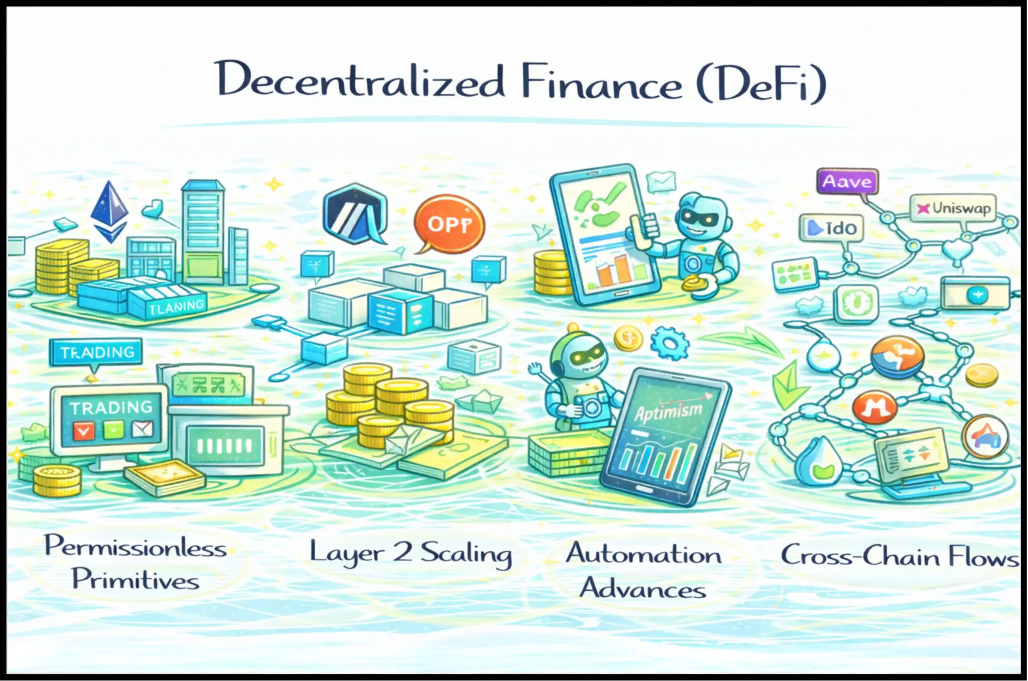 DeFi placed fifth among the Top 5 Performing Crypto Narratives of 2025, ending at -34.79% despite ongoing innovation and deep infrastructure relevance. DeFiâs historical arc is clearly defined: it emerged around 2020 with Ethereumâs smart contracts recreating lending, trading, and yield mechanisms without intermediaries; it surged during DeFi Summer; it suffered major setbacks in 2022 via exploits and liquidity crises; and it recovered through 2023â2024 with Layer 2 scaling and new primitives like liquid staking and perpetual DEXs.