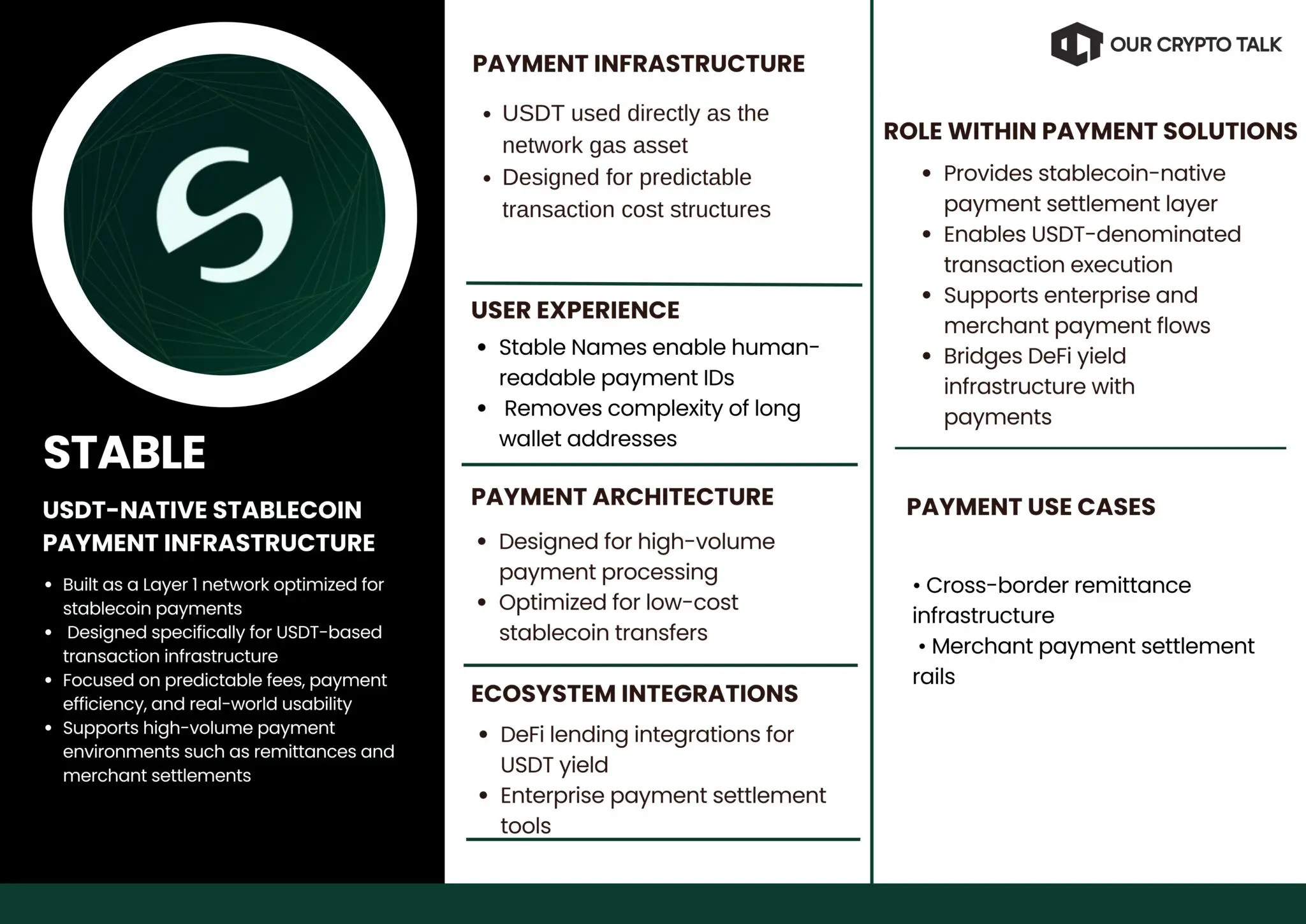 Stable ($STABLE) is a Layer 1 blockchain protocol designed specifically for stablecoin payments, with a primary focus on USD₮ (USDT). Among the top crypto payment projects, Stable focuses on creating infrastructure optimized for USDT-based transactions. Unlike general-purpose blockchains that support a wide range of decentralized applications, Stable is built as dedicated infrastructure for stablecoin-based transactions. The project aims to address persistent limitations in existing stablecoin ecosystems, including unpredictable transaction fees, congestion during high demand, and the need to hold volatile native tokens to pay for gas.