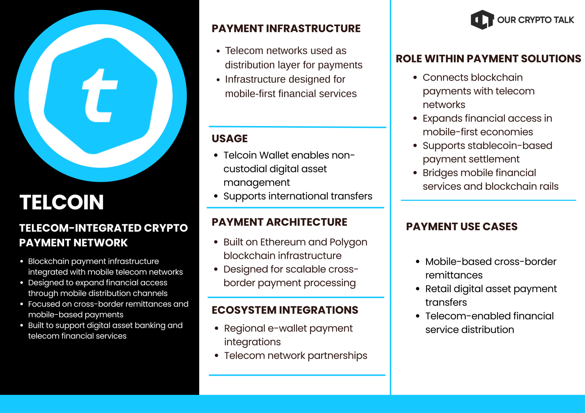 The core concept behind Telcoin is to use mobile network infrastructure as a distribution layer for blockchain-based financial services. In many regions, particularly in developing economies, mobile phone adoption significantly exceeds access to traditional banking services. By integrating blockchain payments with telecom networks, Telcoin aims to provide digital financial services to populations that remain underserved by conventional financial institutions.