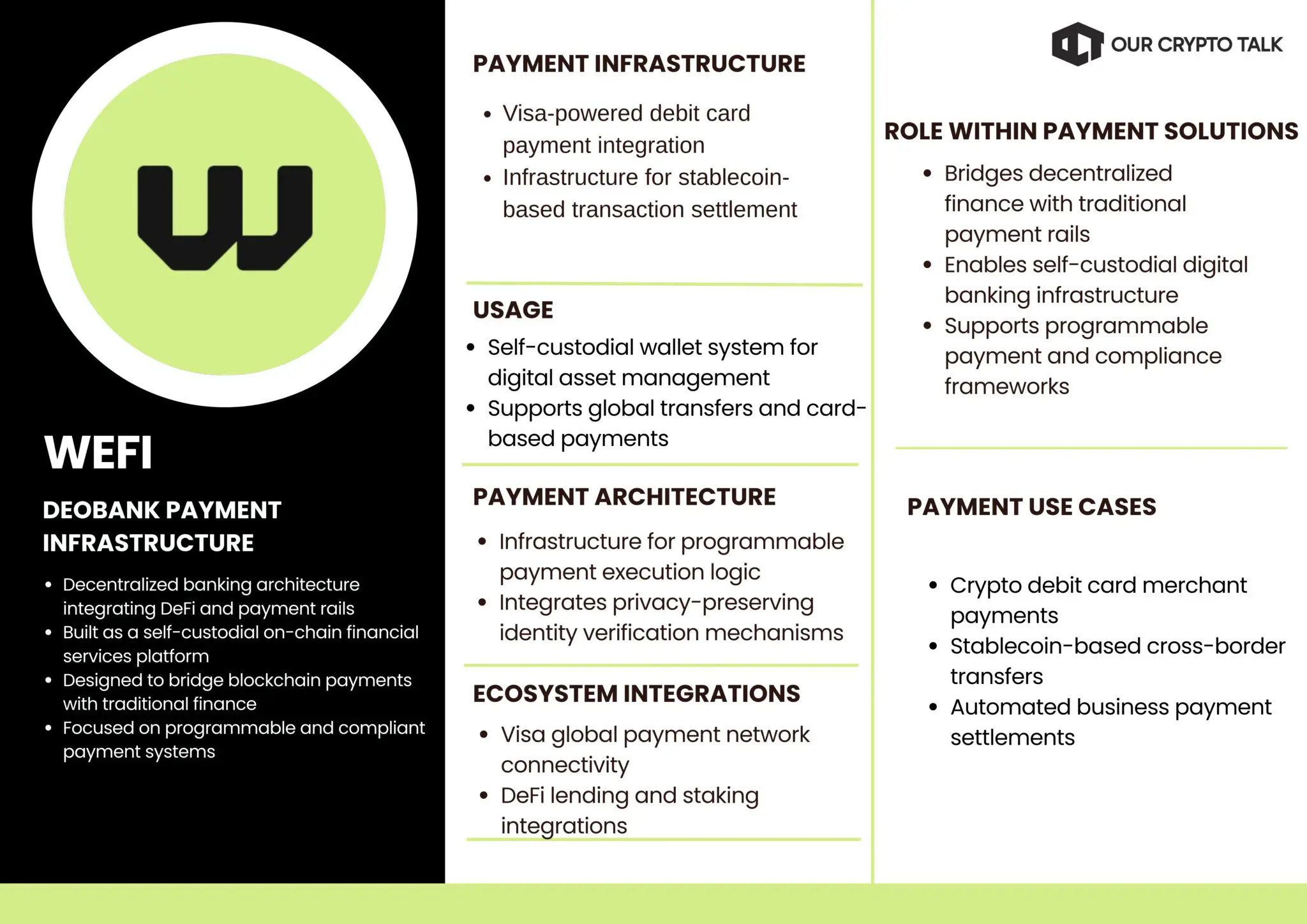 By combining traditional payment infrastructure with decentralized asset custody, WeFi aims to provide a banking-style experience while maintaining blockchain-based financial control.