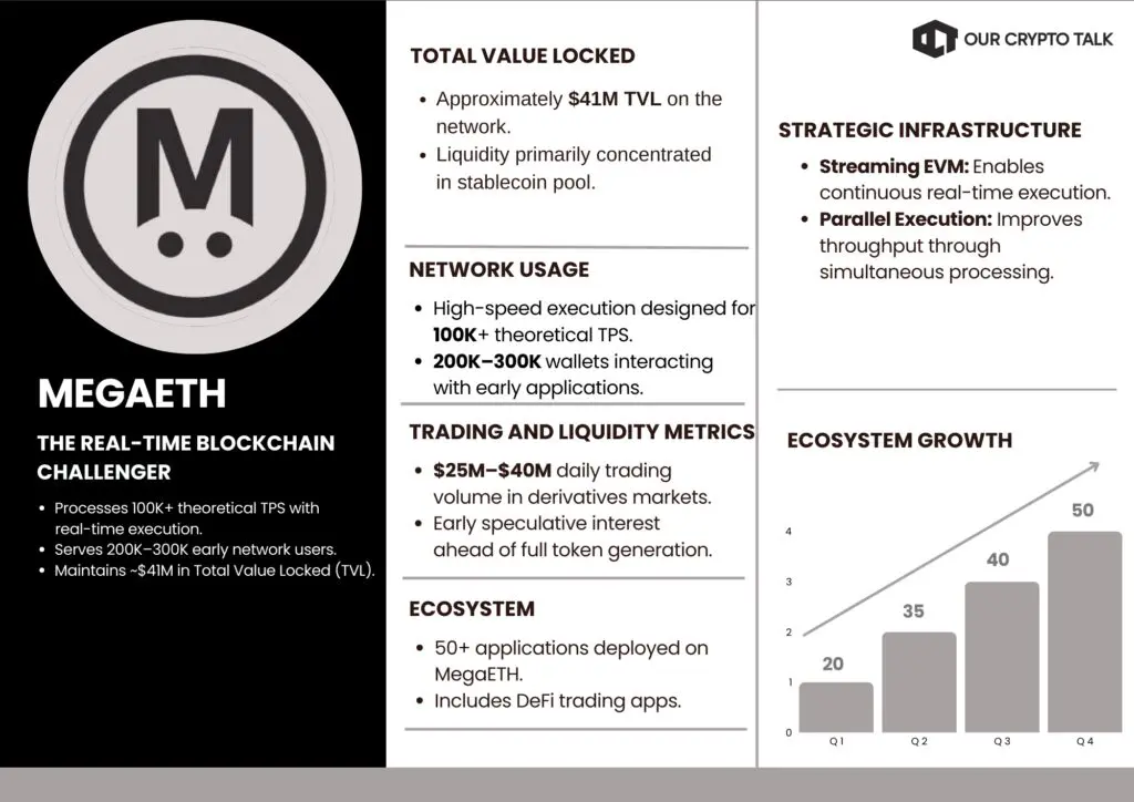 Early adoption metrics show strong initial activity. MegaETH processed nearly 39 million transactions within its first day and onboarded over 50 live applications across DeFi, gaming, and payments. Its total value locked has reached approximately $41 million, primarily in stablecoins.