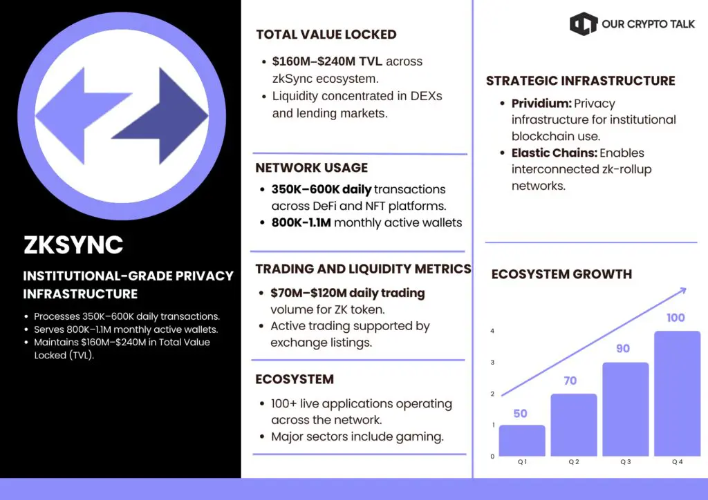 ZKsync has positioned itself as a leading zero-knowledge Layer 2 network focused on privacy, scalability, and institutional adoption. As of early 2026, ZK maintains a market cap near $200 million and supports consistent trading volume.