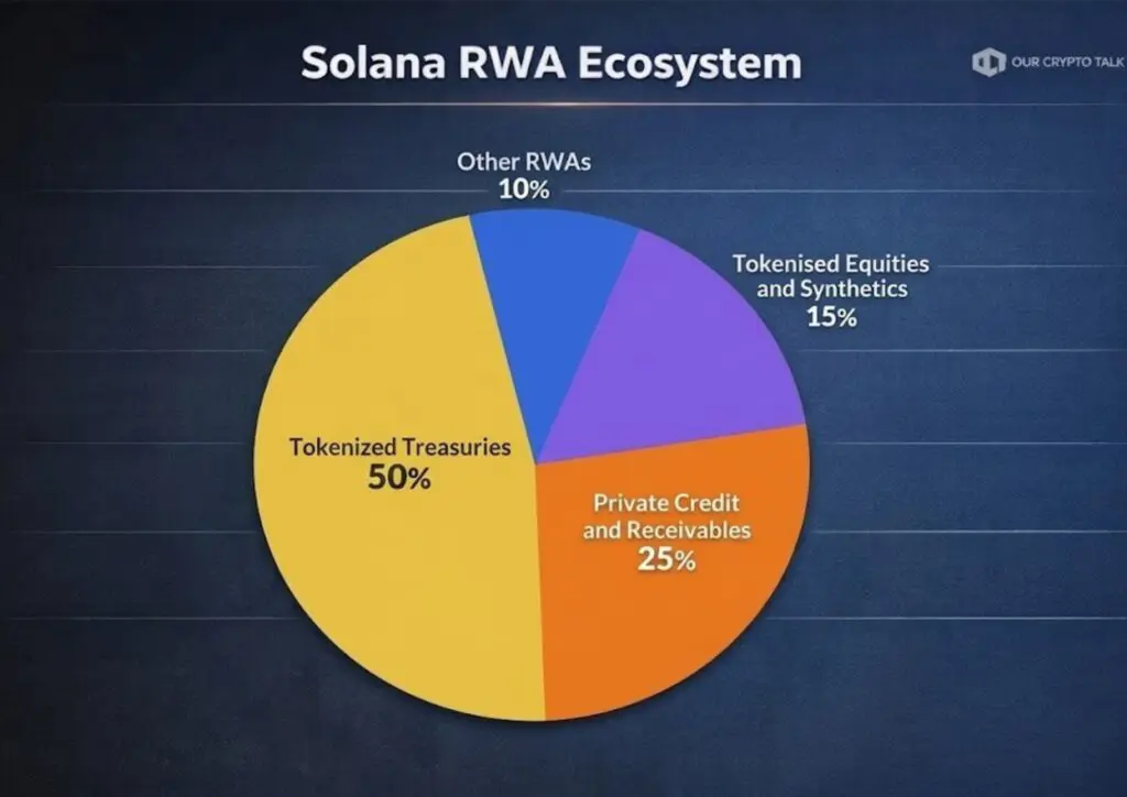 • Tokenized Treasuries (50%) – ~$1.08B in value, representing the largest share of Solana’s RWA ecosystem through tokenized U.S. Treasury exposure and yield-bearing government debt instruments.