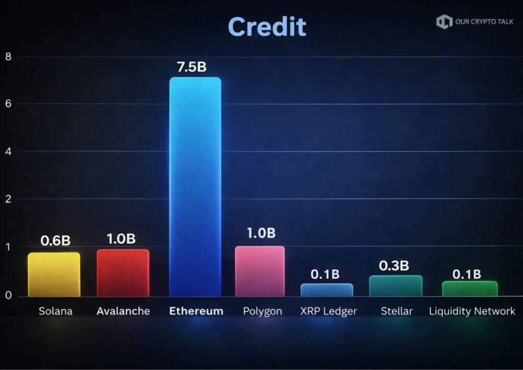 • Solana (~$0.4–0.9B) is emerging as a faster, retail-accessible venue for on-chain credit products and fintech-linked lending markets.