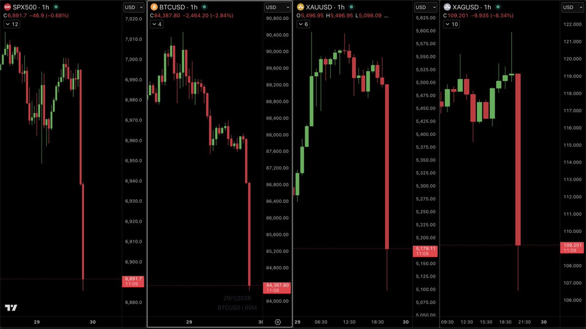BREAKING: Global markets are in a total freefall In just 45 minutes, over $2.8 TRILLION in wealth has completely vanished: 1. Gold: -$1.5 Trillion wiped out in a historic crash ( down nearly -10% ) 2. Silver: Down a staggering -12% 3. Bitcoin: Plummeting to $84,500 4. S&P 500: https://t.co/m7rqR0cKMk