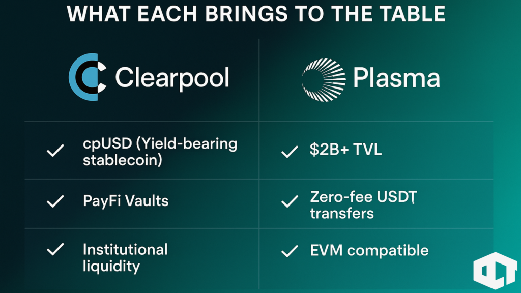 25th September 2025 â Clearpool has officially partnered with Plasma, a purpose-built blockchain designed for stablecoin payments. As part of the deal, Clearpool will bring its flagship yield-bearing stablecoin, cpUSD, to Plasmaâs mainnet. It will also introduce PayFi Vaults, offering institutional investors access to stablecoin credit opportunities.