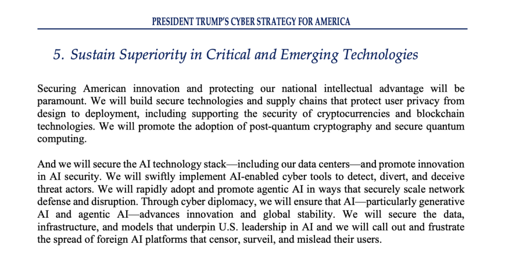 That section also emphasizes securing AI systems, developing post-quantum cryptography, protecting data center infrastructure, and countering foreign technology platforms that may enable surveillance or censorship.