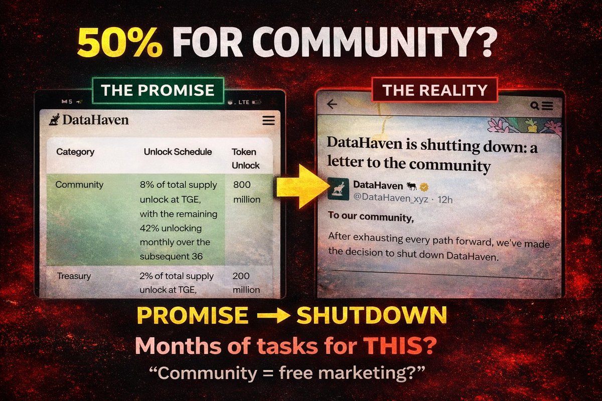 𝗥𝗲𝗺𝗲𝗺𝗯𝗲𝗿 𝗗𝗮𝘁𝗮 𝗛𝗮𝘃𝗲𝗻? @DataHaven_xyz The same project that promised: “50% airdrop for the community.” “Building for users.” “Decentralizing the future.” For months they made people grind 15–20 tasks every single week. Post this. Share that. Invite friends. https://t.co/zNuYZx2RWS